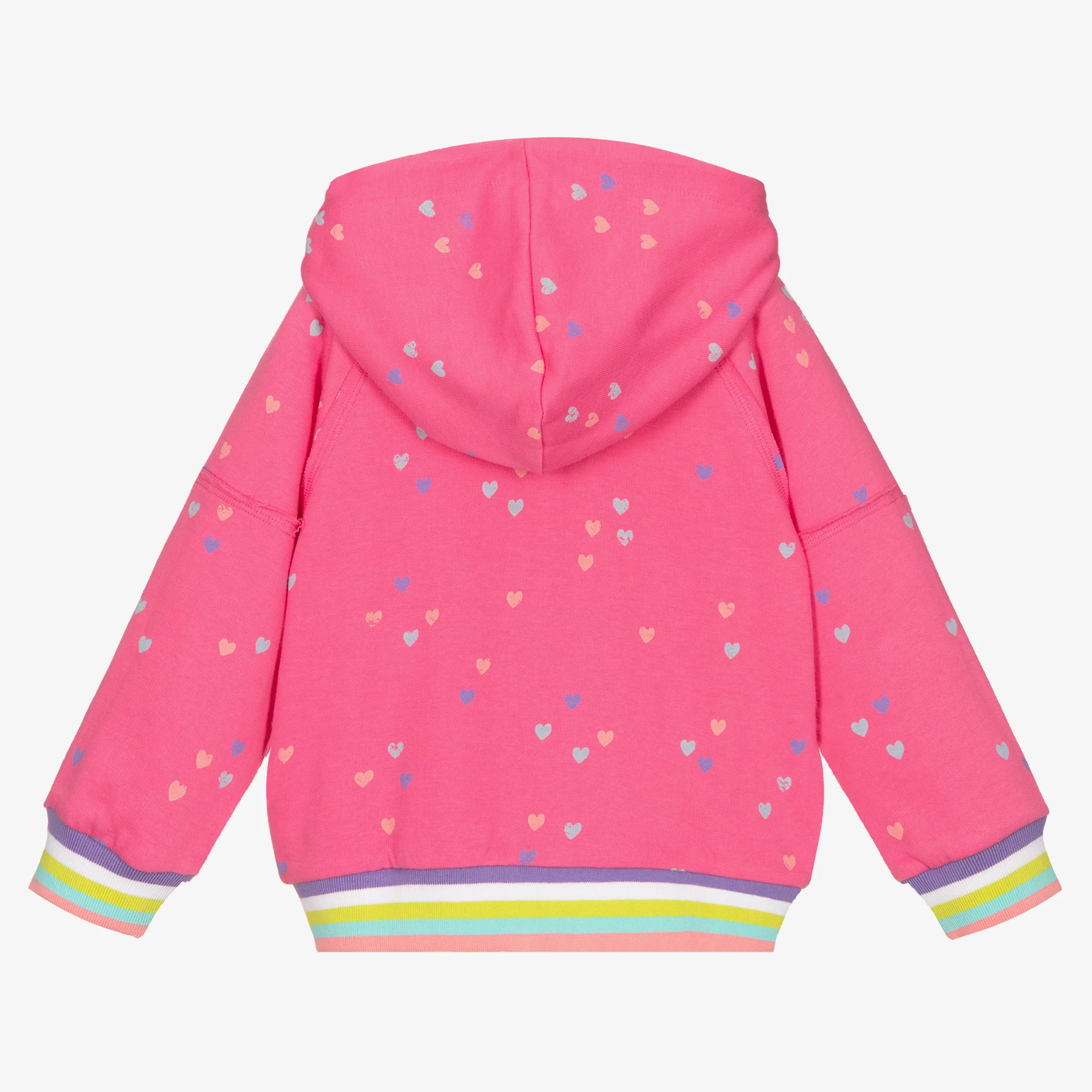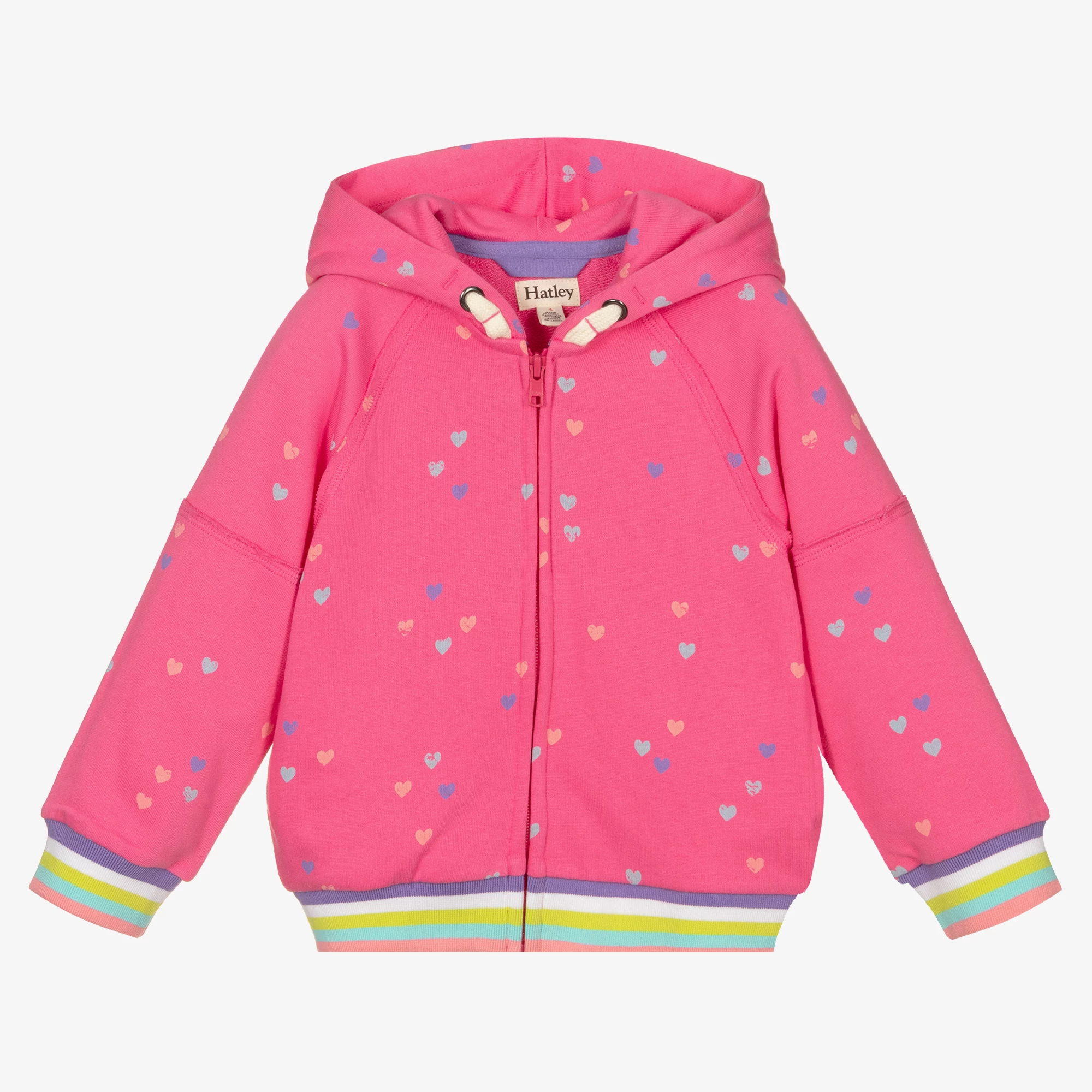 Pink hooded zip-up top for girls by Hatley, made in soft cotton jersey. It has a pretty heart pattern in blue, pink and purple, with multicolour striped ribbed trims. There are raw-edged seams, side pockets and a faux drawstring detail on the hood.