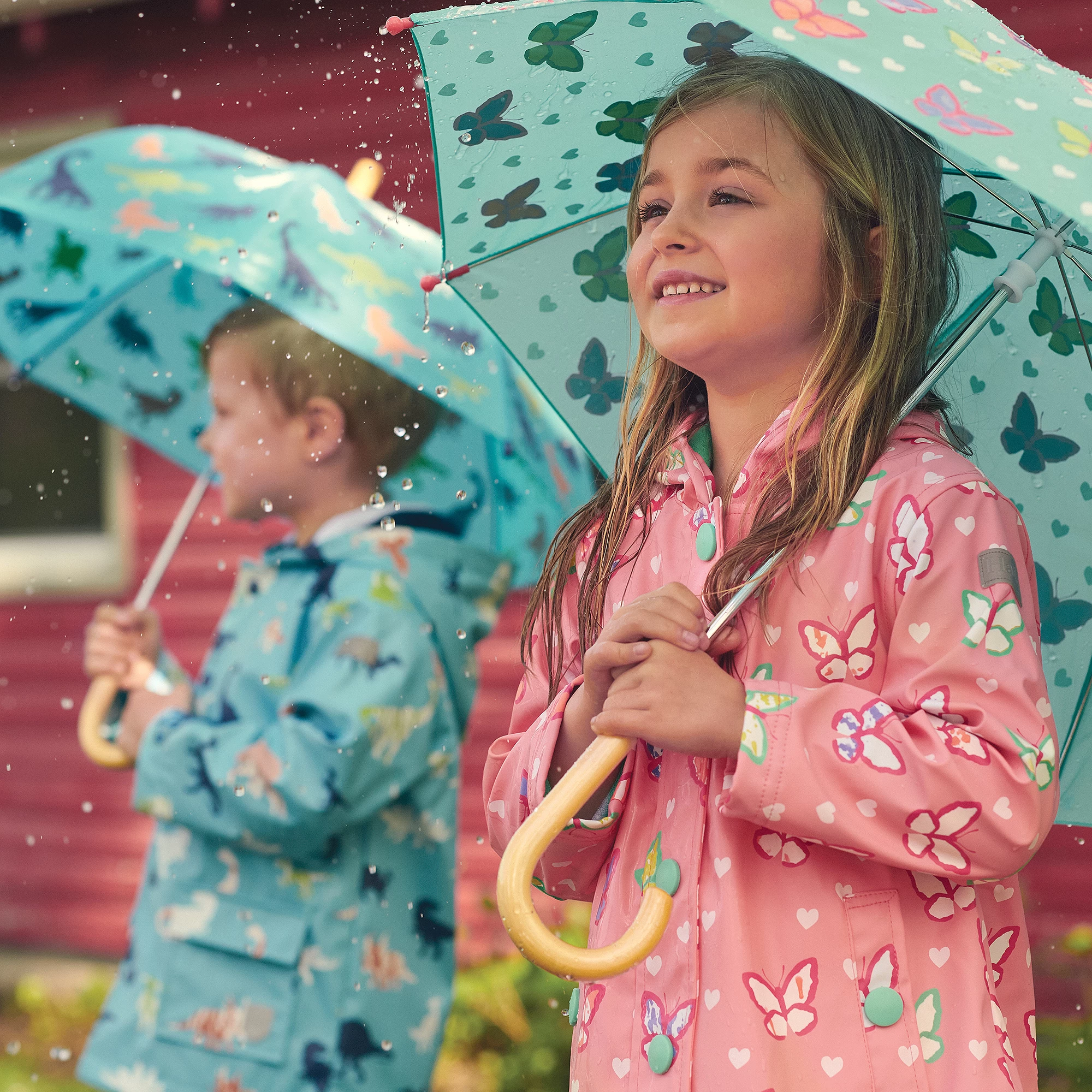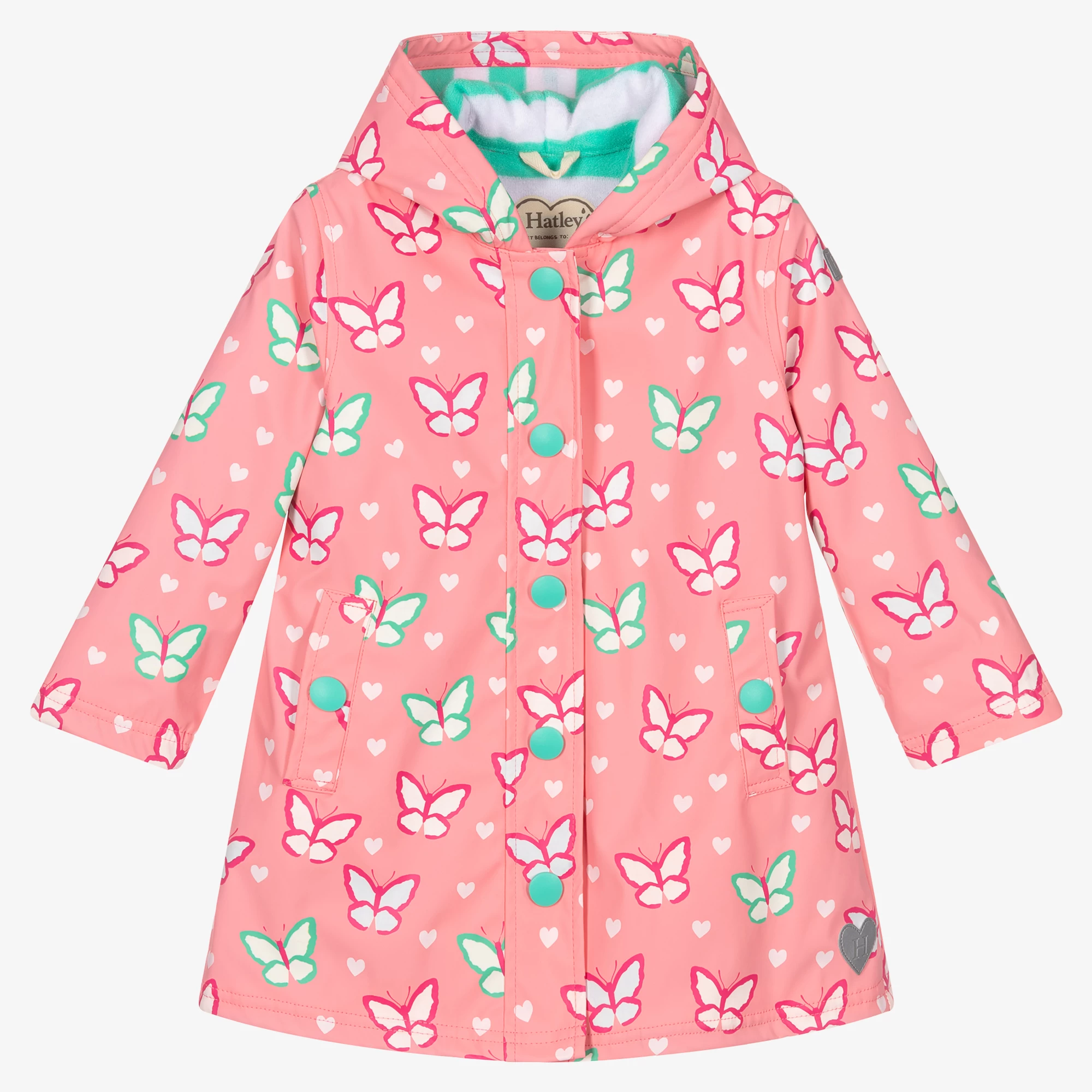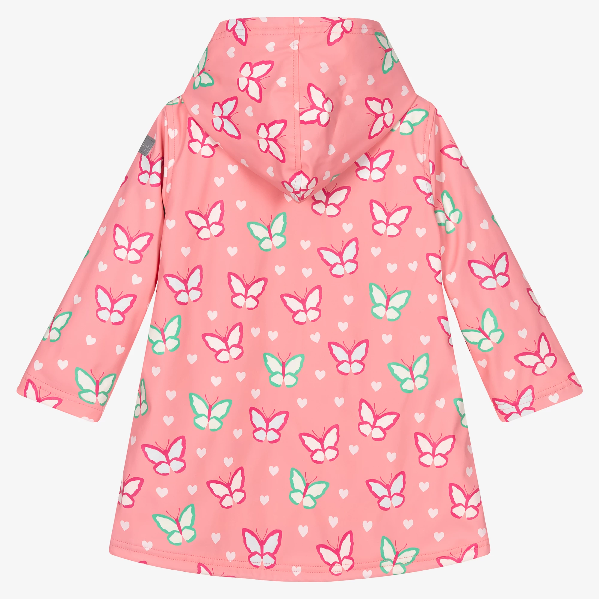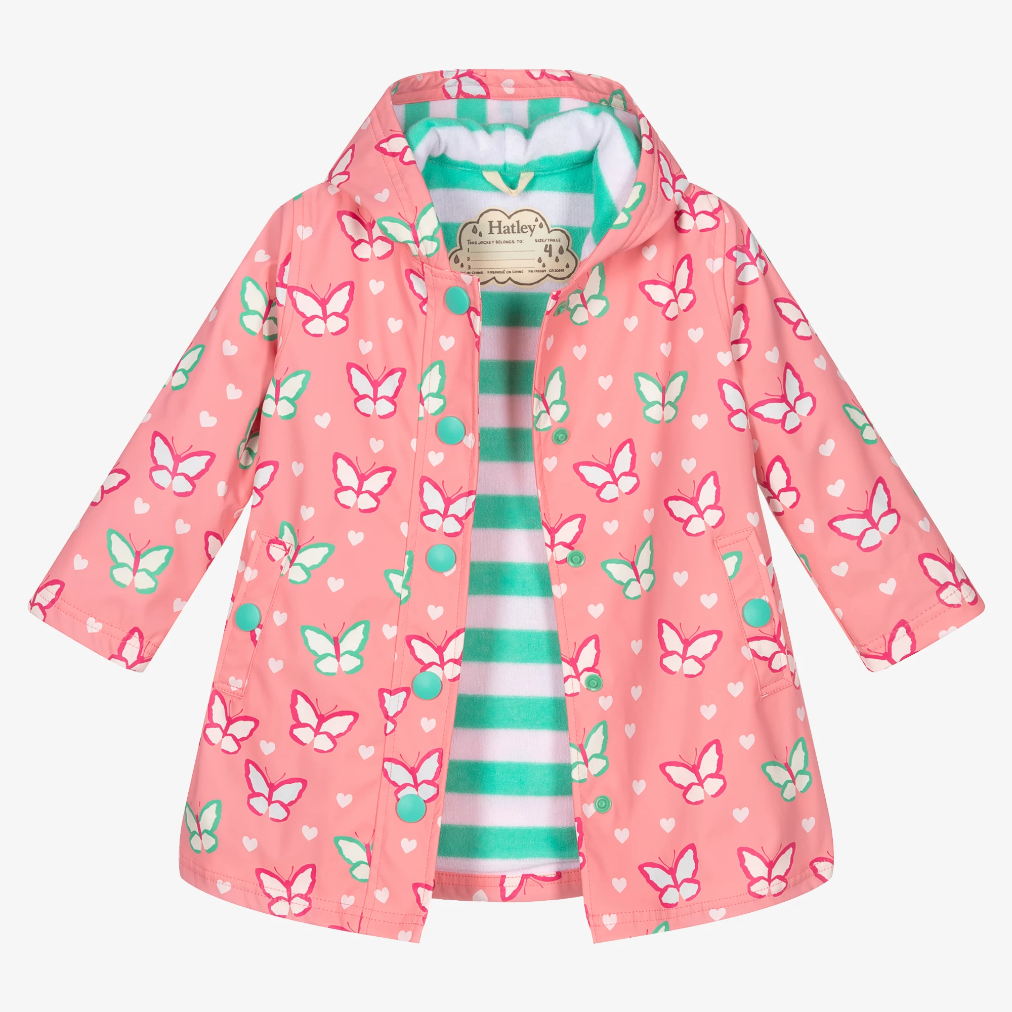 Pink waterproof hooded raincoat for girls by Hatley. It has a super soft PVC-free outer shell, patterned in a pink and green butterfly print which changes colour when wet. Lined in green and white striped terry towelling, it fastens with poppers on the front and has reflective logo badges.