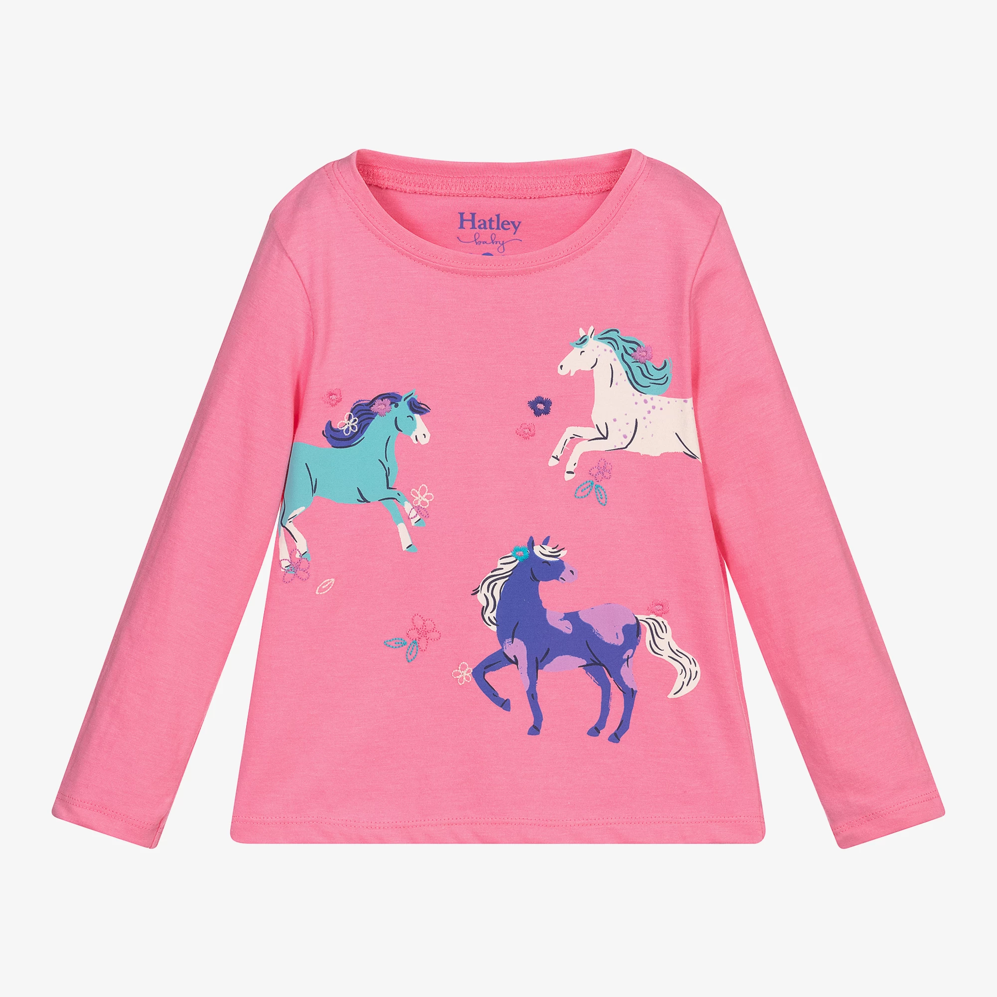 Girls pink top from Hatley, made in soft cotton-blend jersey. It has a colourful frolicking horses print on the chest and is gathered on the back.