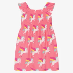 Soft and comfortable dress for girls by Hatley, made in stretchy cotton jersey. The pink fabric has a lovely all-over Pegasus print and a smocked bodice, with ruffle straps that are stitched in a v-shape on the back.