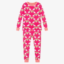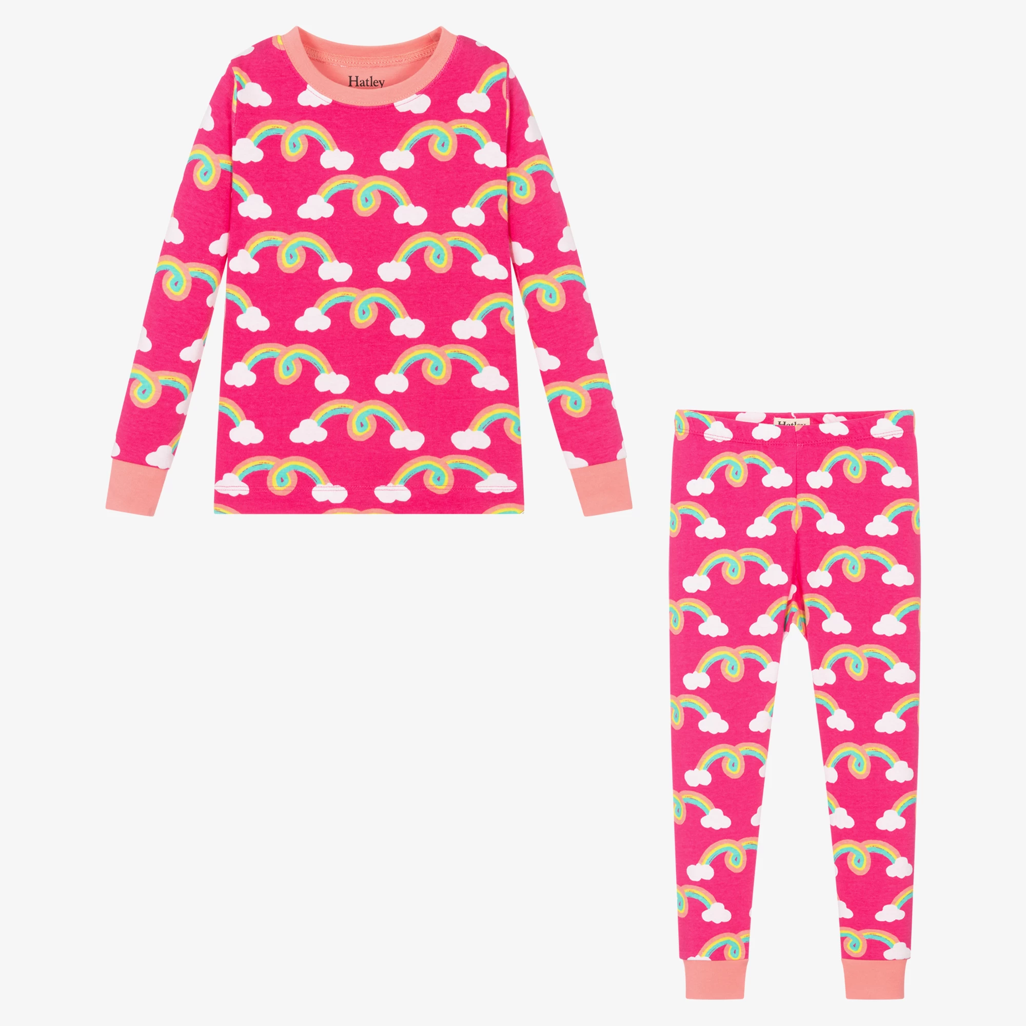 Bright pink pyjamas for girls by Hatley with a colourful rainbow print. Made in soft cotton jersey and designed to fit snugly, they have pale pink ribbed trims. The top is embroidered with a pink logo on the back of the neck and the bottoms have a comfortable elasticated waistband.