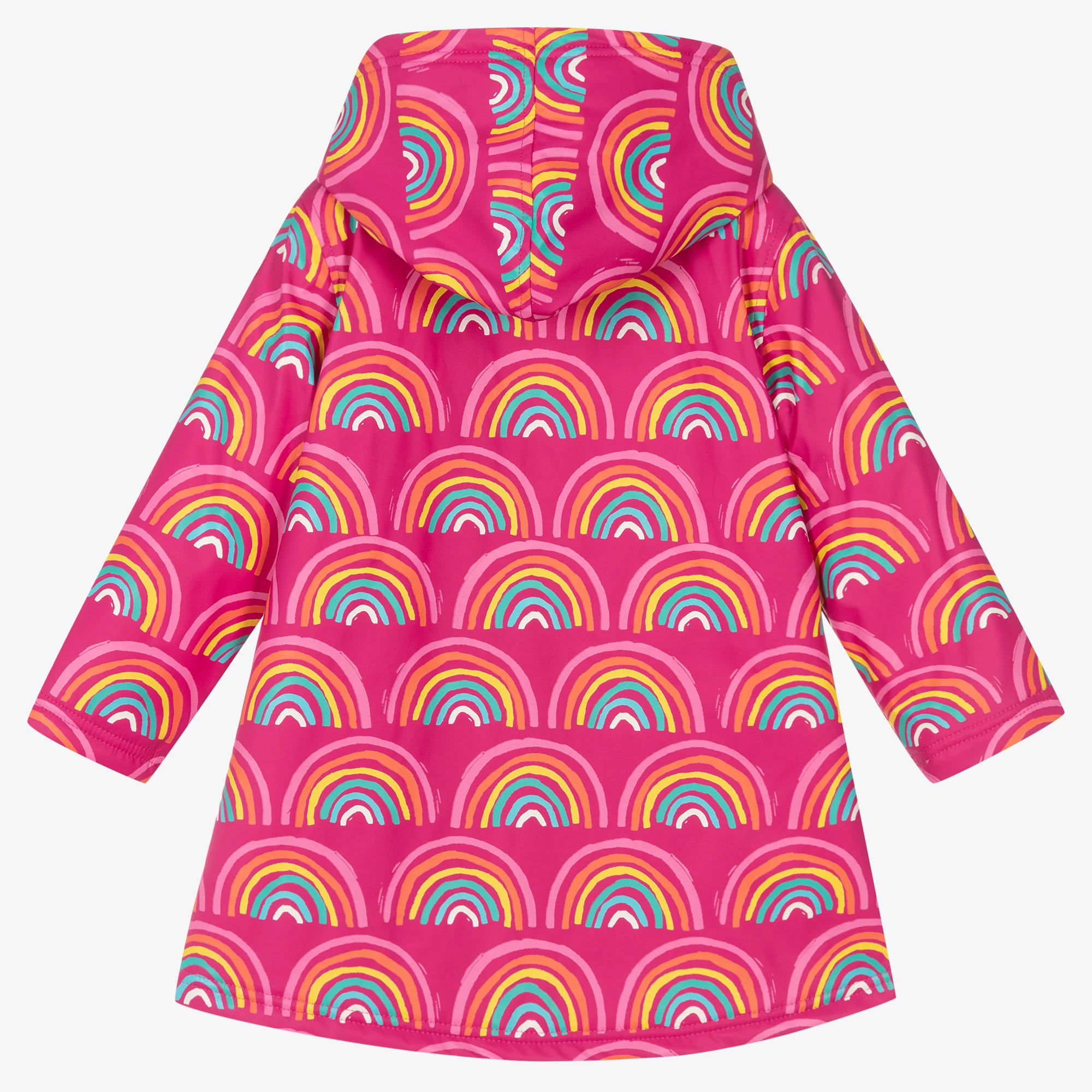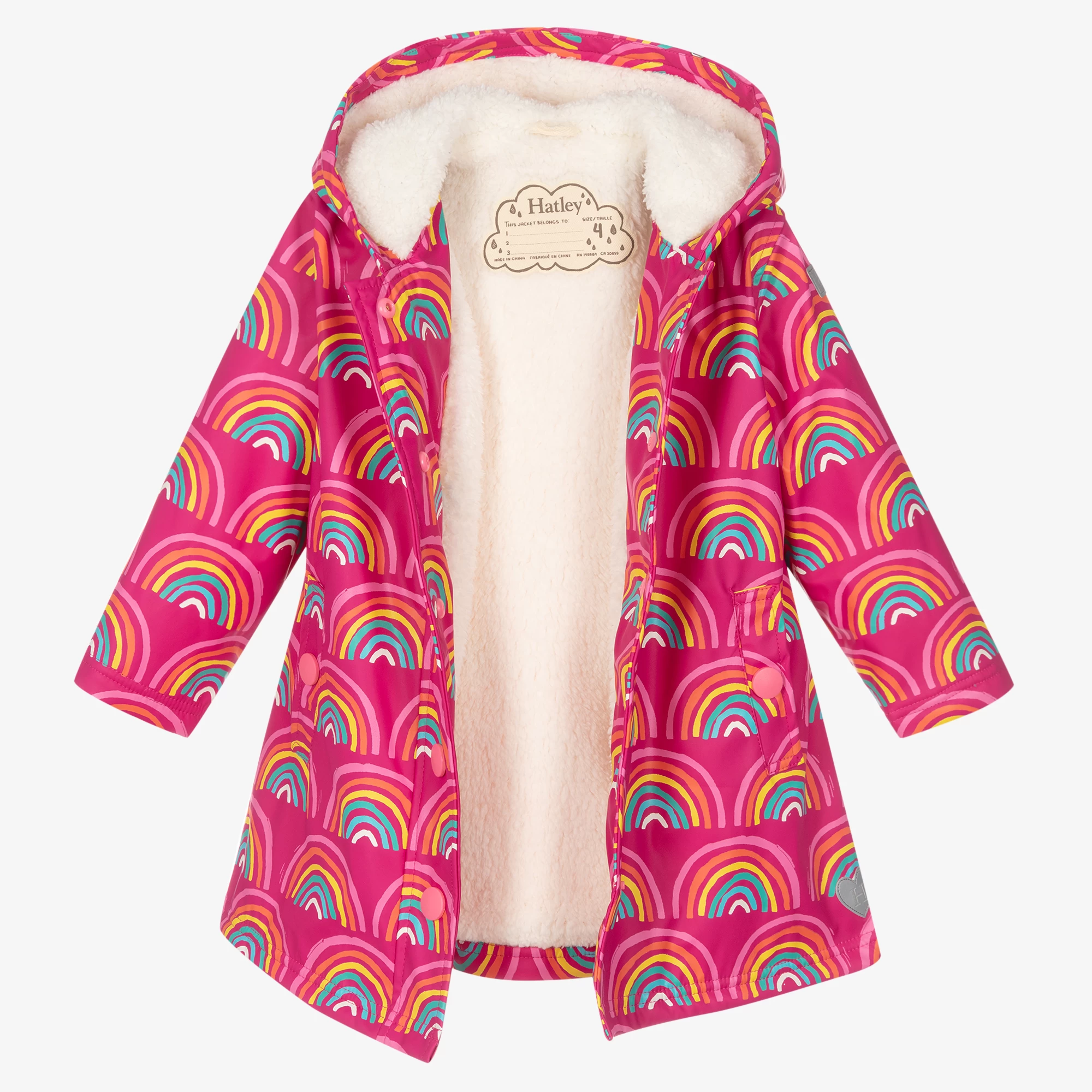 Pink hooded raincoat for girls from Hatley, made in smooth, coated polyester. It has a brightly coloured rainbow pattern. This jacket is PVC free and has an ivory sherpa fleece lining for added warmth. It fastens with front poppers and has reflective logo badges and popper-fastening front pockets.