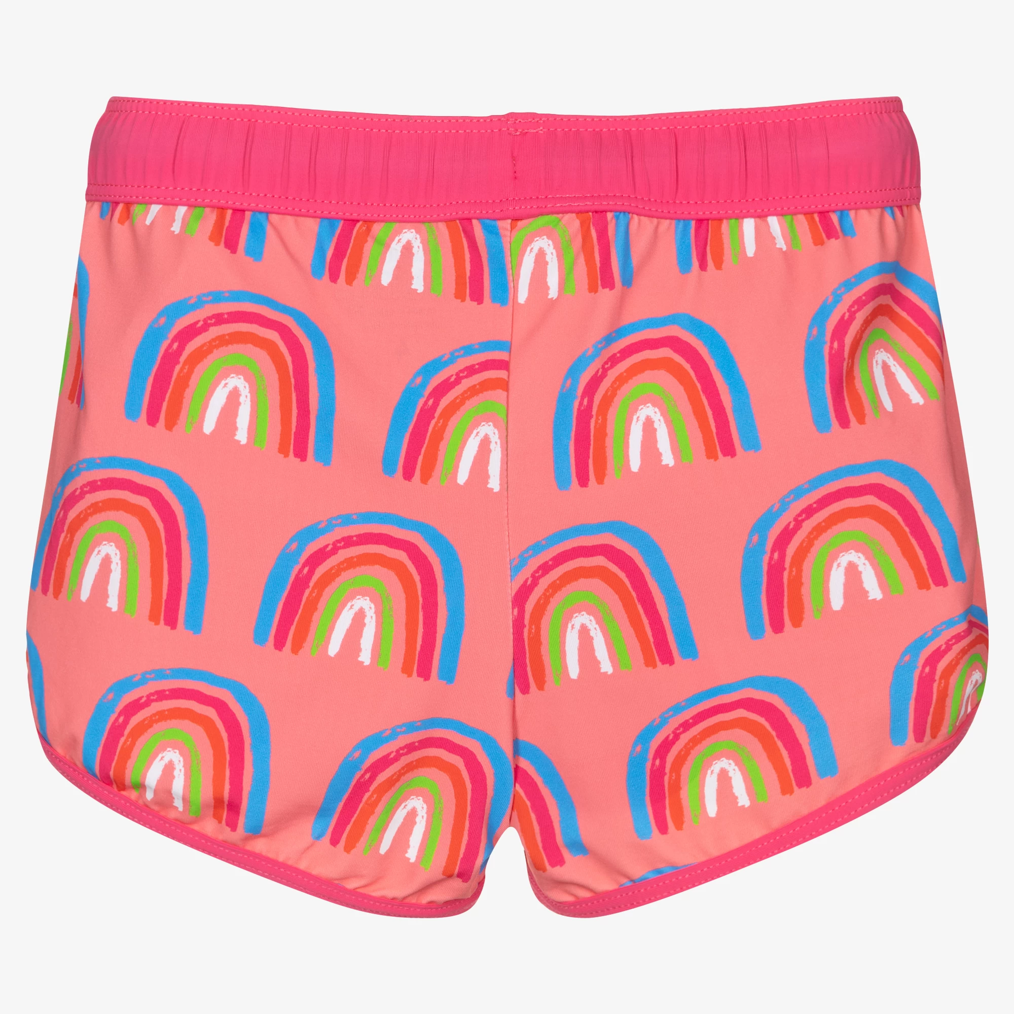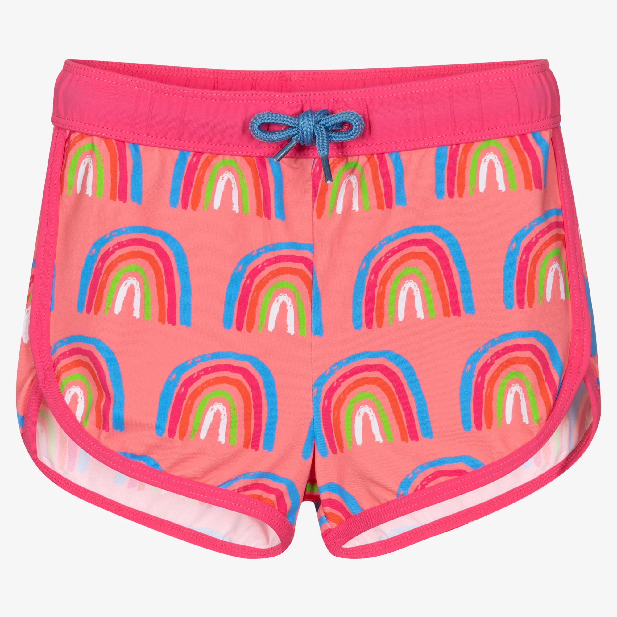 Pink swim shorts for girls by Hatley, with a fun and colourful rainbow print. Silky soft and stretchy, they have an elasticated drawstring waist.