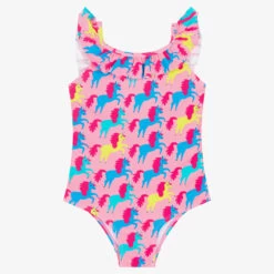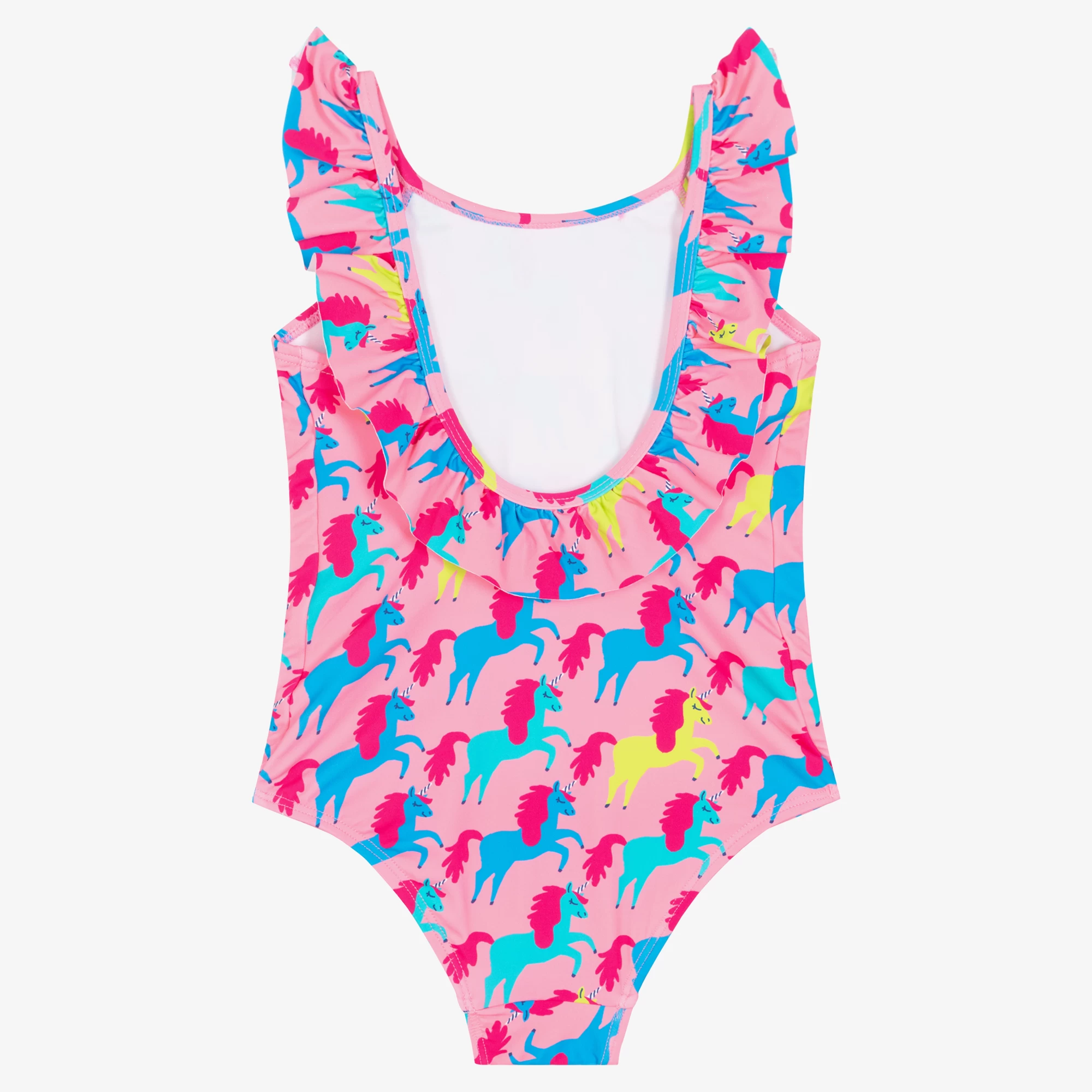 Pretty pink swimsuit for girls by Hatley, with an all-over pattern of vibrant unicorns. So lovely, it has a ruffle trim around the neck and all the way to the scooped back. It is made in silky smooth, chlorine & salt water resistant UPF50+ fabric and has a full lining for added comfort.