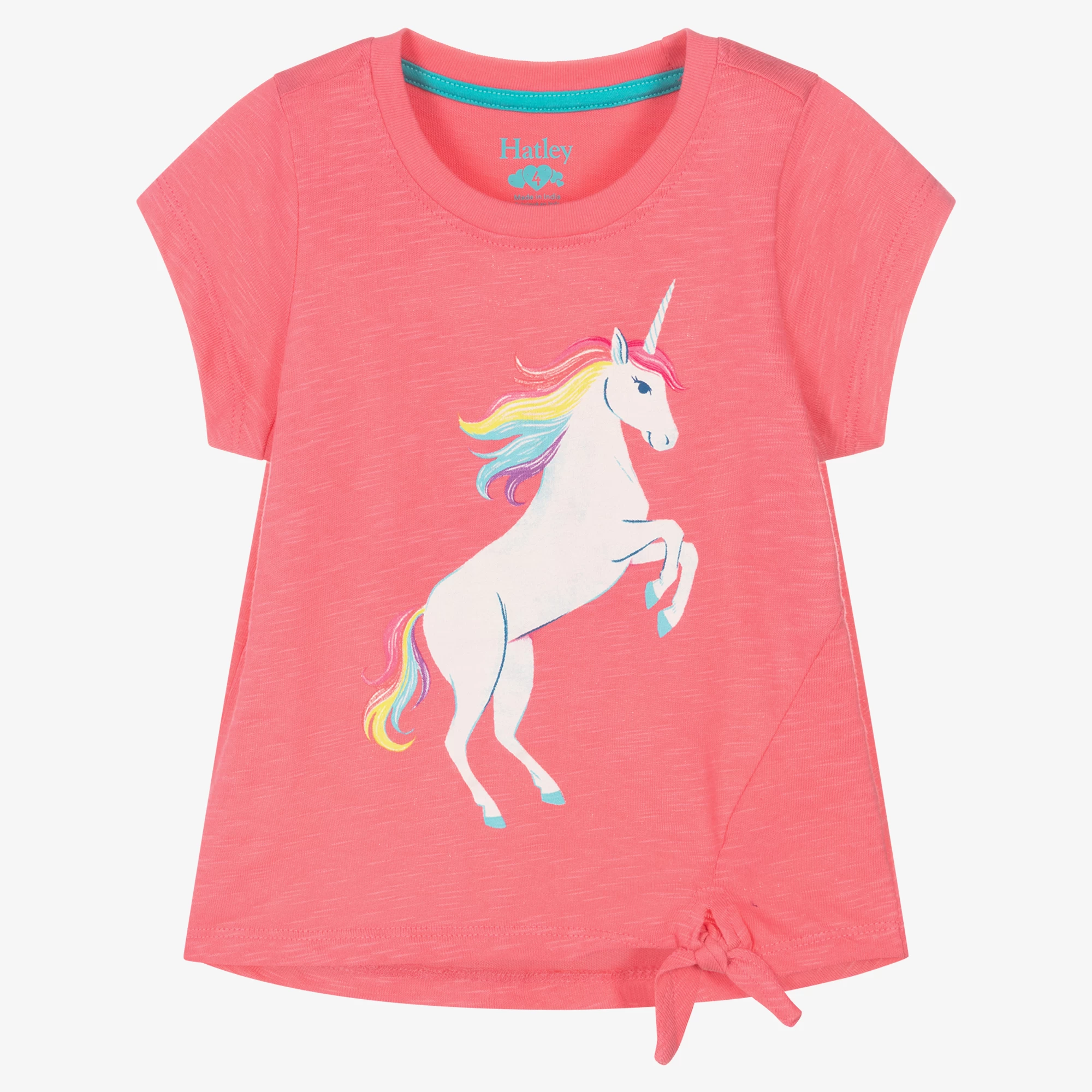 Pink T-shirt for girls by Hatley. With a galloping unicorn print on the front, this colourful tee has a tie front and is made in soft slub cotton jersey.