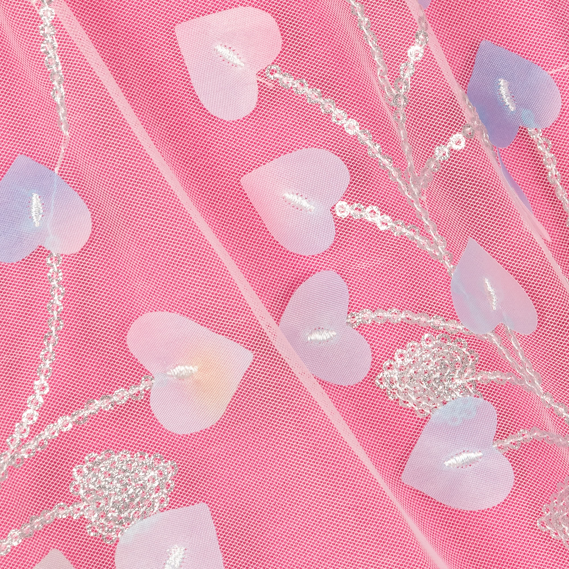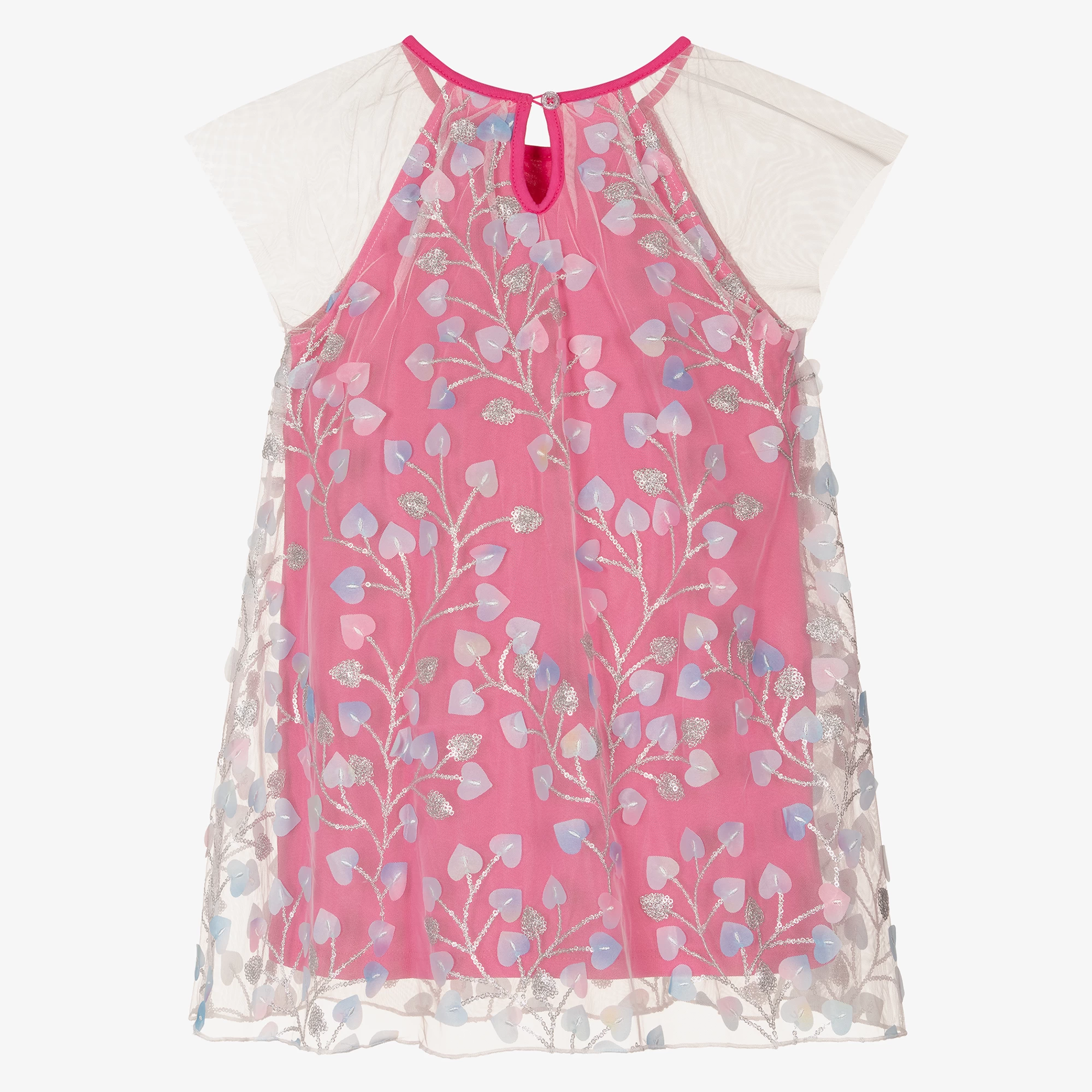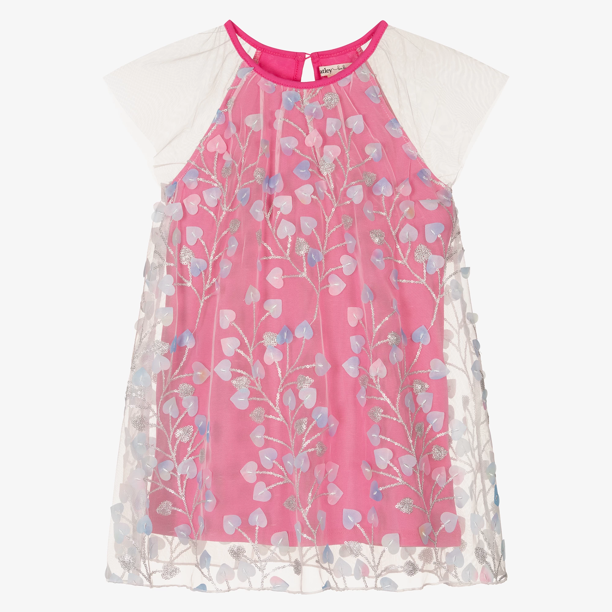 A lovely white and pink tulle dress for younger girls by Canadian brand Hatley. Sheet on the sleeves, the tulle overlay is patterned with all over silver sequinned branches, with pink and purple 3D heart petal appliqués. There is a single button fastening on the back and for comfort, the fuchsia pink lining is made in soft cotton jersey.