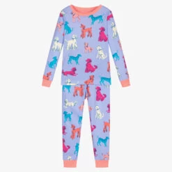 Pretty lavender purple long pyjamas for girls by Hatley, made in organic cotton jersey and designed to fit snugly. They have pink trims and a sweet puppies print in shades of pink and blue, with pale pink logo embroidery on the back of the neckline.
