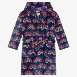 Bold blue rainbow patterned dressing gown for girls by Hatley, made in super soft polyester fleece. This hooded gown fastens with a tie around the waist and has two front pockets.