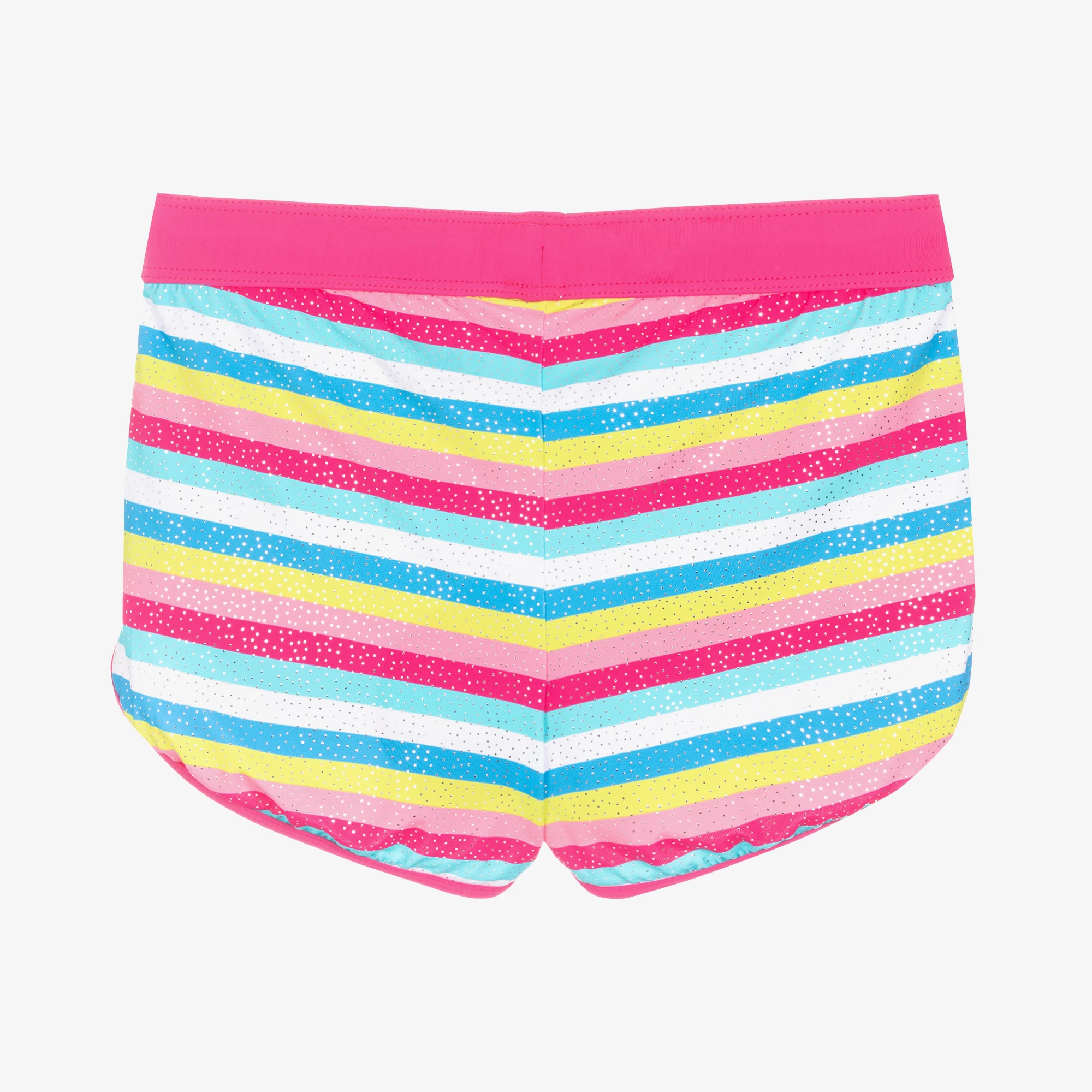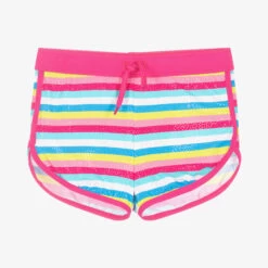 Fun rainbow striped swim shorts for girls by Hatley, with sparkly silver speckles throughout. Silky smooth and stretchy, they are comfortable to wear as casual beachwear or for a splash in the pool. They have pretty tulip hem with pink trims and an elasticated drawstring waist for a good fit.