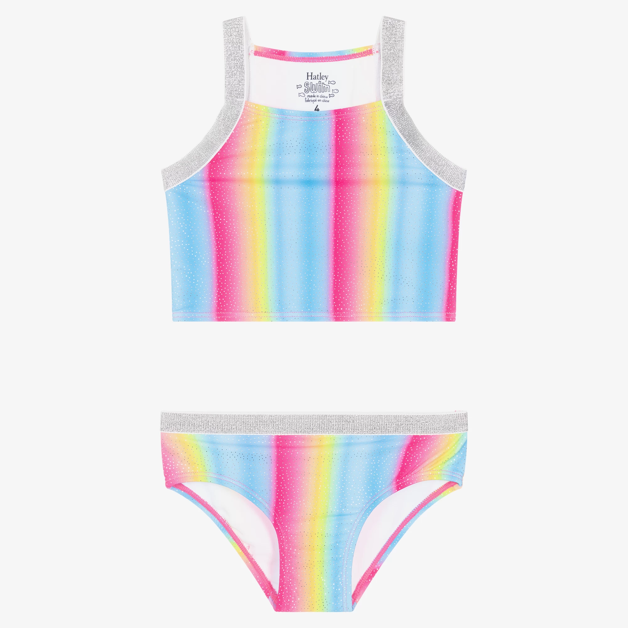 Fun and vibrant tankini for girls by Hatley, in a vertical rainbow print with silver speckles throughout for a touch of sparkle. The elasticated silver lurex straps and waistband give it a stylish, coordinated look. The UPF50+ fabric is super smooth and silky on the outside and fully lined for added comfort.