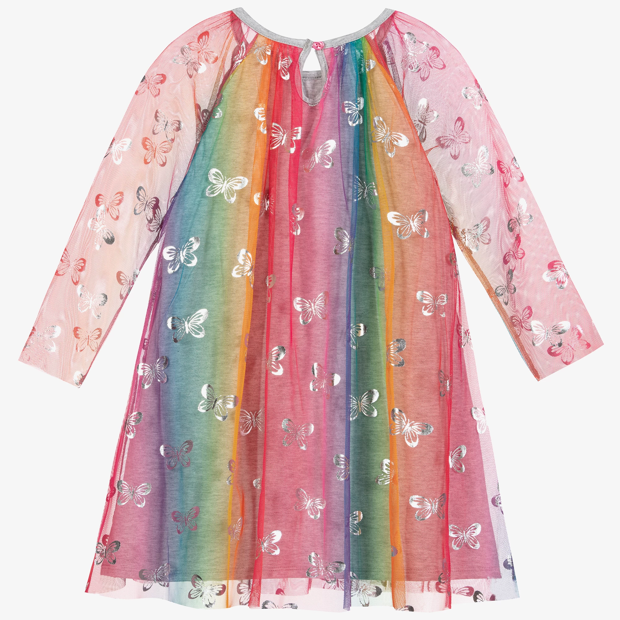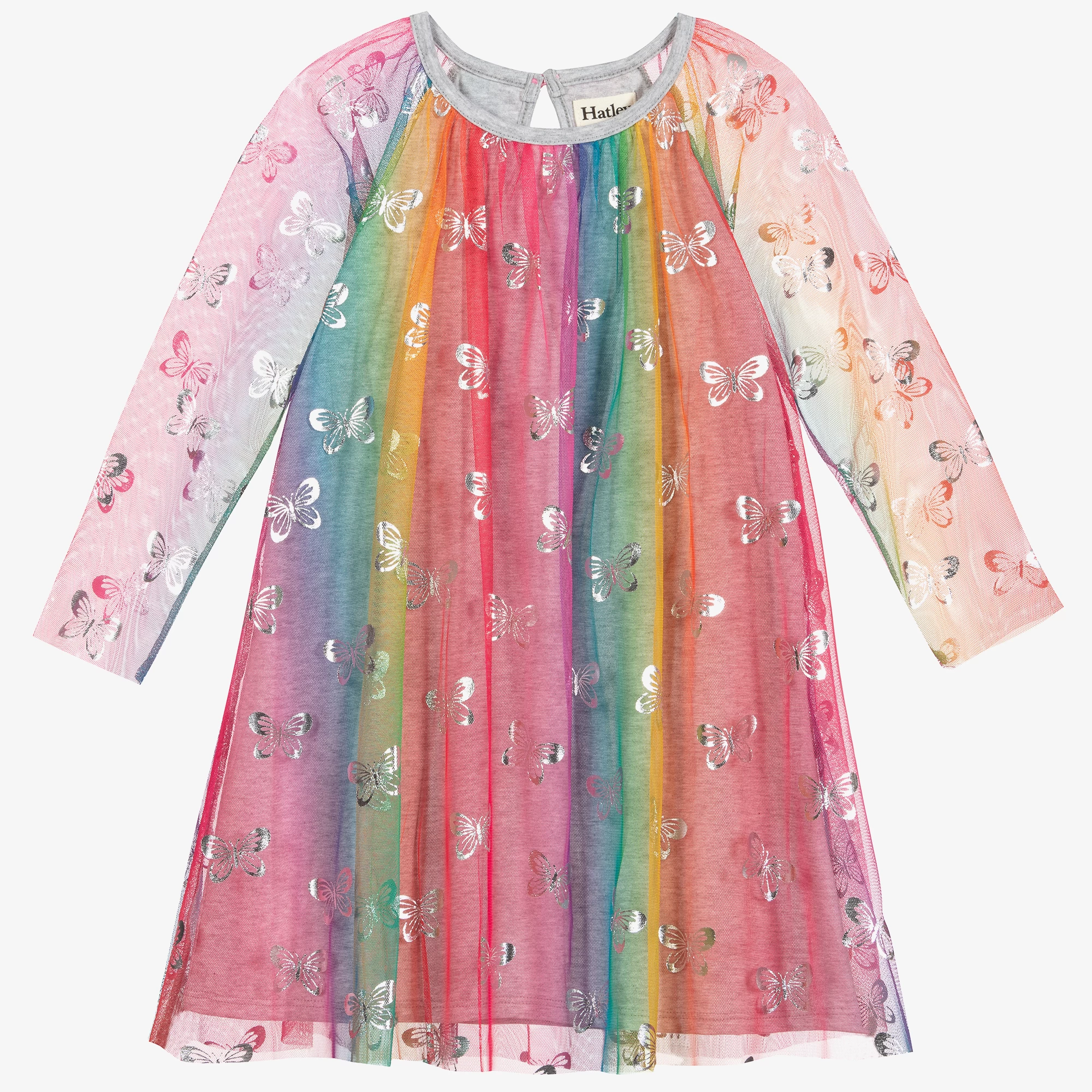 Multicoloured tulle dress for girls by Hatley. Made in pale grey soft cotton jersey, the pretty rainbow tulle overlay is patterned with shimmering silver butterflies.