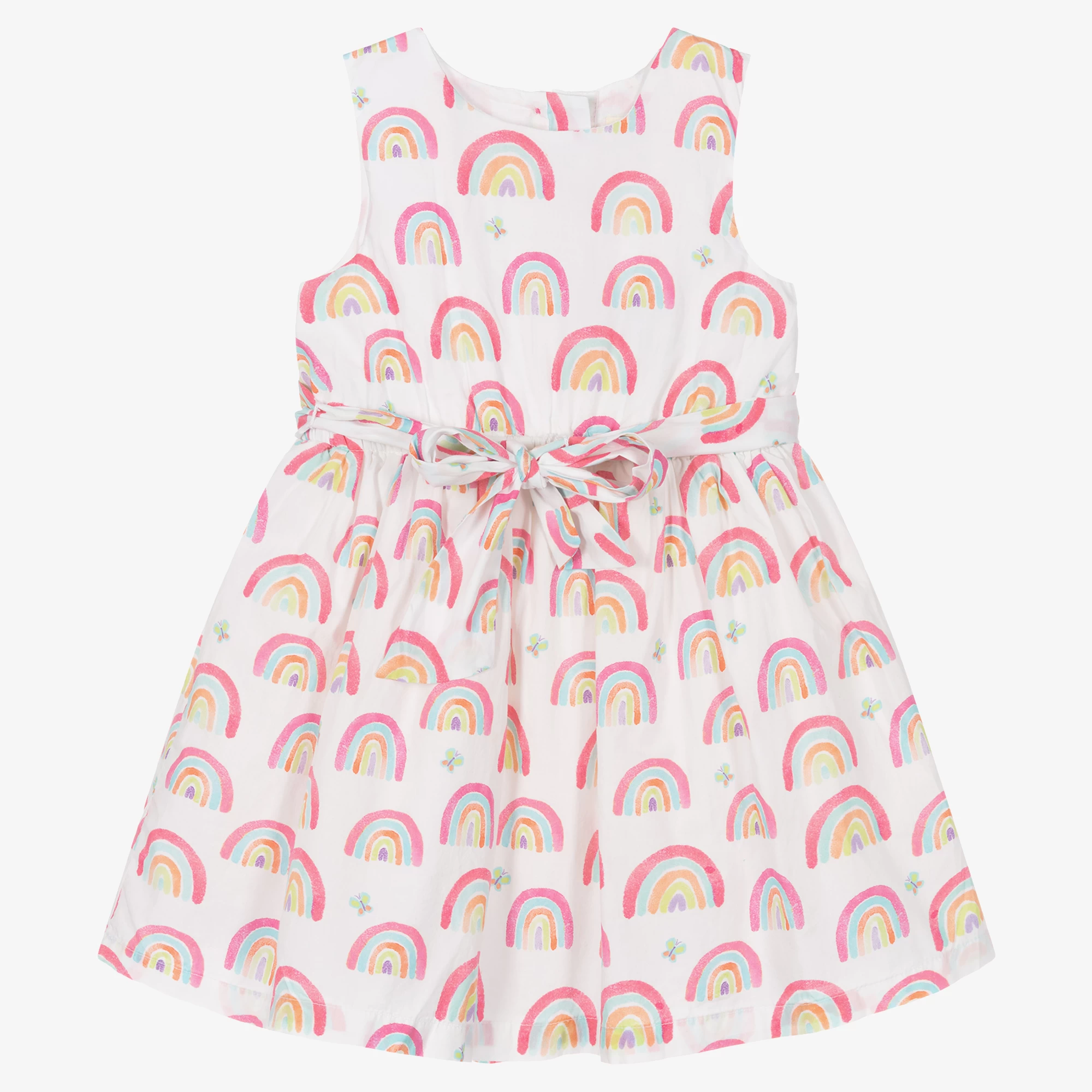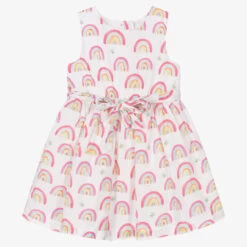 Lovely white dress for girls by Hatley, patterned in a fun and colourful rainbow print. Made and lined in soft cotton, it has layers of lightweight tulle under the skirt for added volume. Fastening with buttons on the back, it has an elasticated waist with a removable sash that ties into a bow on the front.