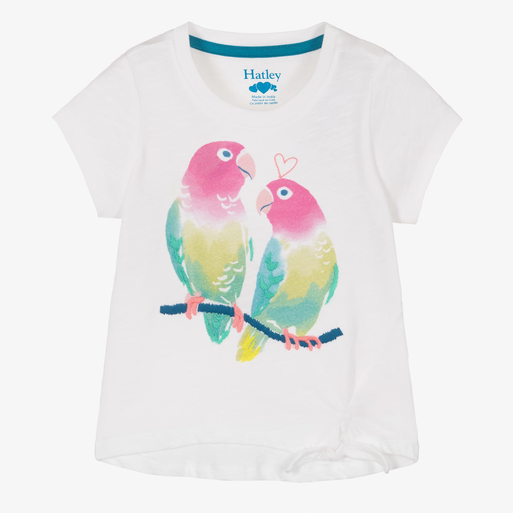White cotton T-shirt for girls by Hatley. The front of the T-shirt features a colourful print of two parrots with embroidered details. It features a longer rounded hem at the back and an asymmetrical tie detail at the front.