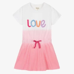 Cute white and pink ombré dress for girls by Hatley, made in soft cotton jersey. The front is decorated with pink, purple and orange tassels, spelling out ‘Love’. The waist has a pink sparkly bow and elasticated trim, creating a lovely silhouette.