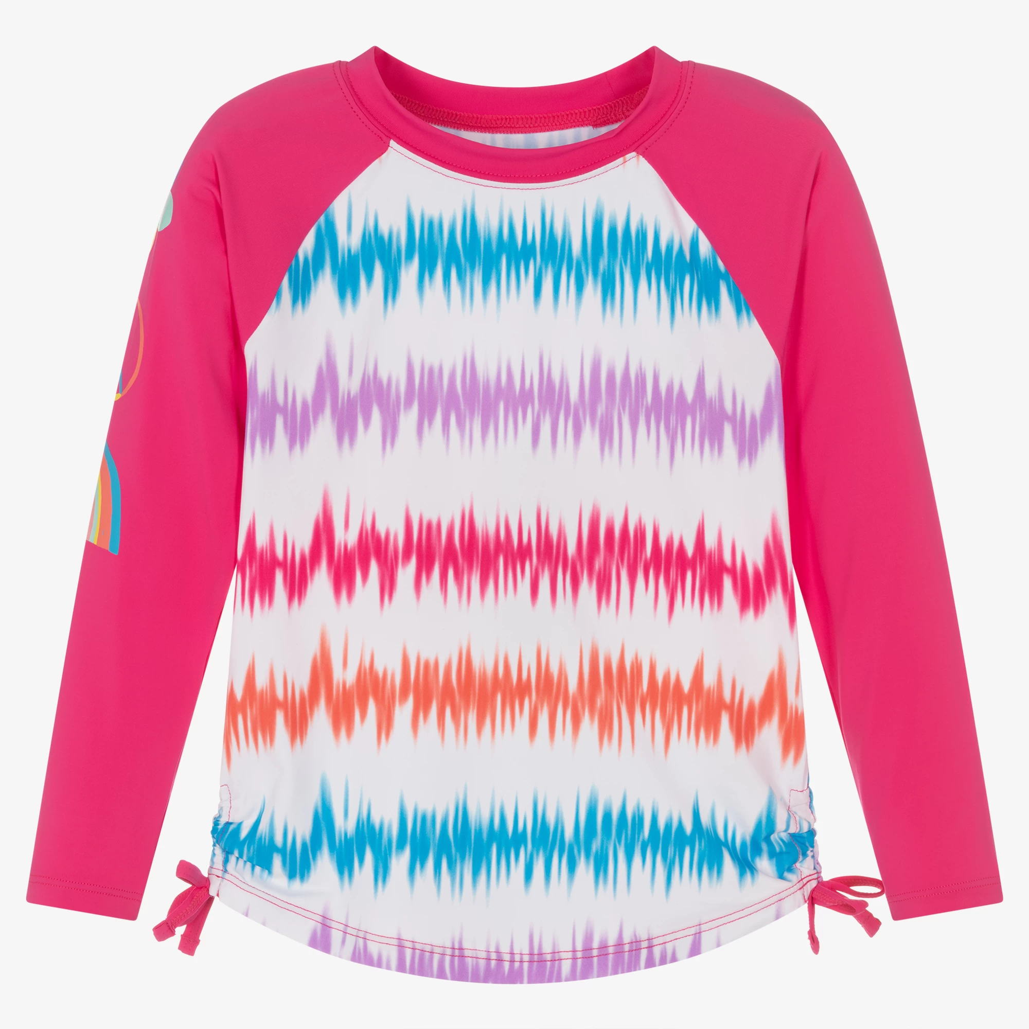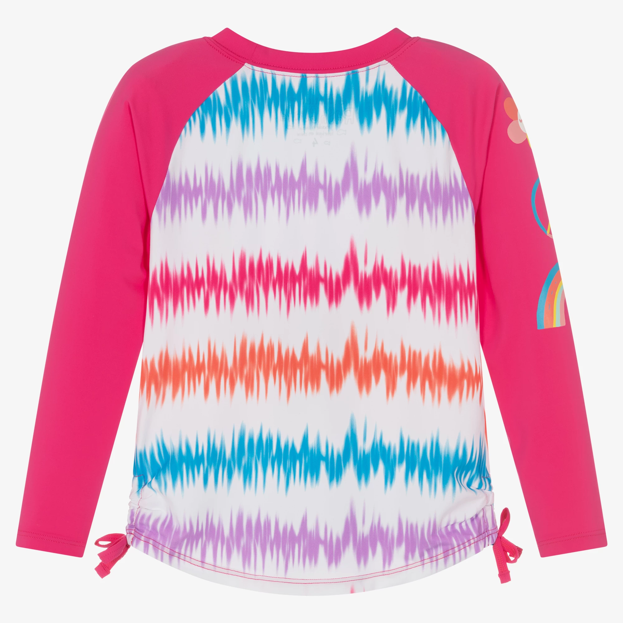 White and fuchsia pink sun protective top for girls by Hatley, with UPF50+. Colourful and summery, it has tie-dye stripes printed on the body with a cute flower, peace sign and rainbow printed on one of the long sleeves. Silky smooth and stretchy, there are pretty gathered detailing with pink fixed bows on the sides.