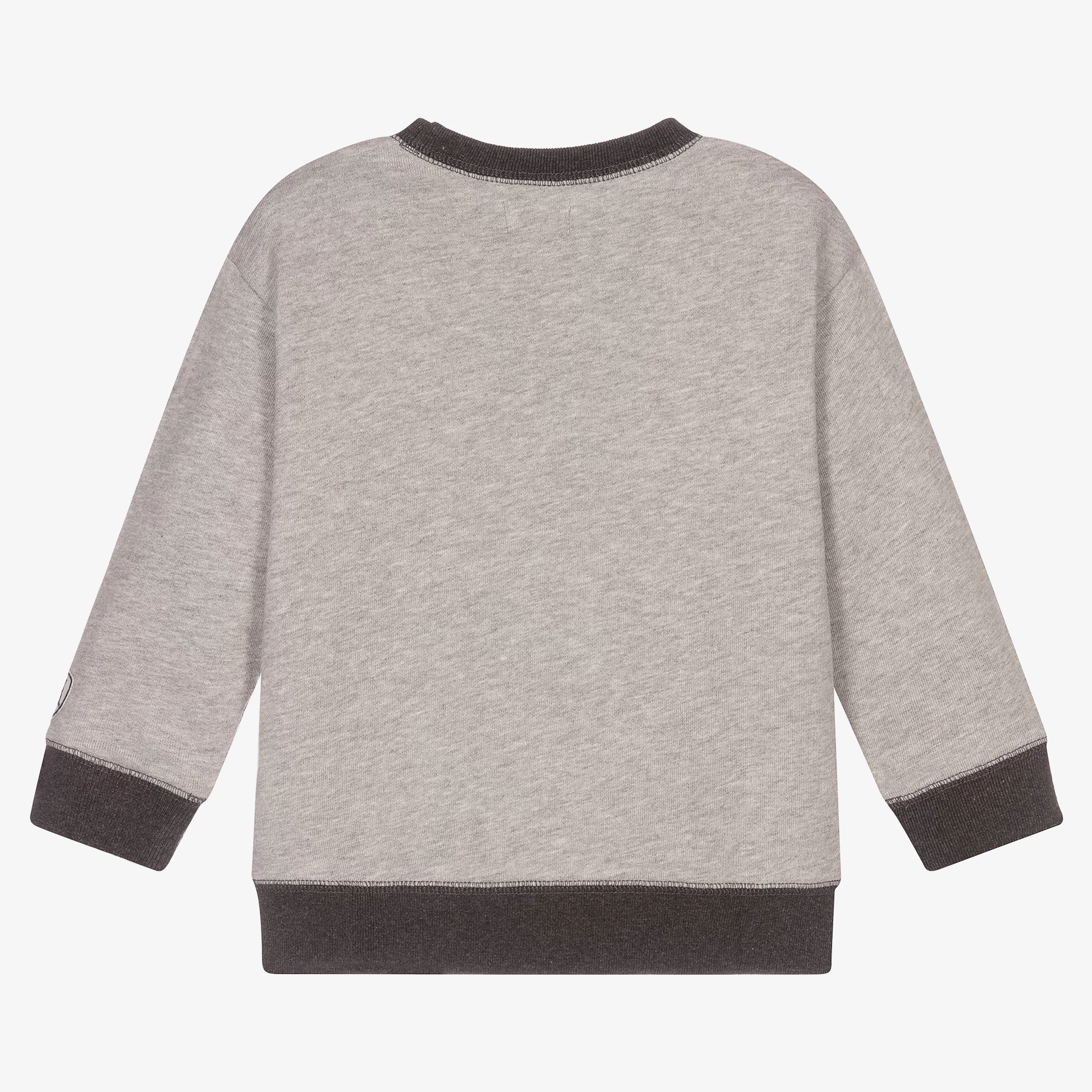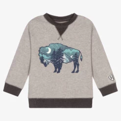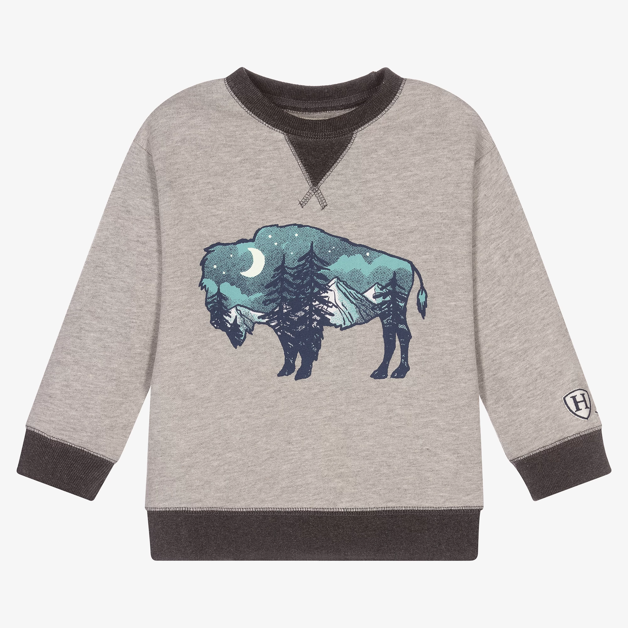 Grey marl sweatshirt for boys by Canadian brand Hatley, with a fun glow-in-the-dark buffalo on the front in navy and turquoise blue. Made in lightweight jersey, it has contrasting grey ribbed trims and a crest logo badge on one sleeve.