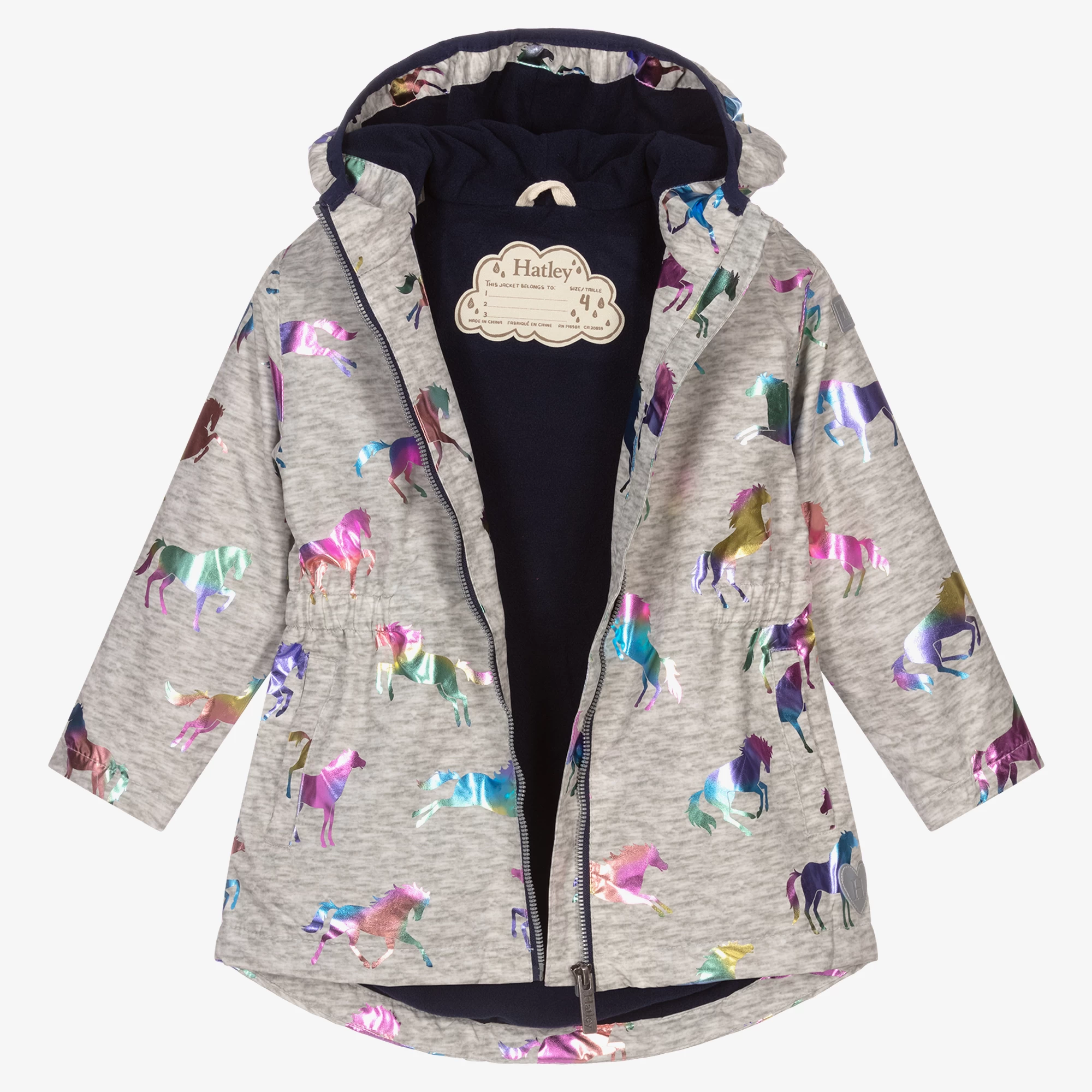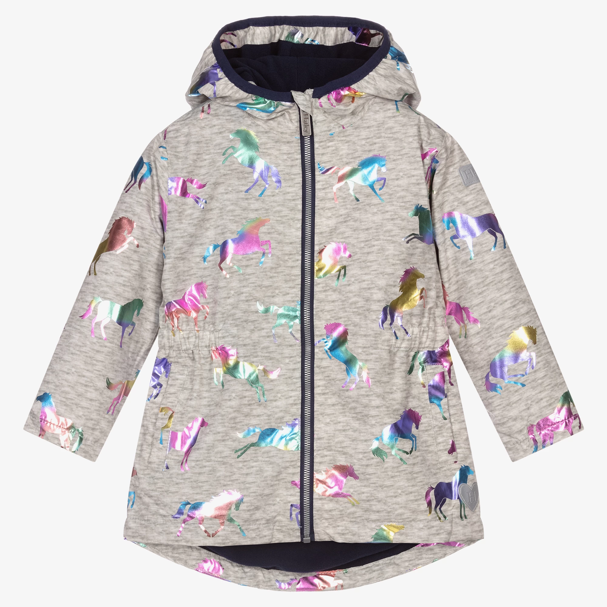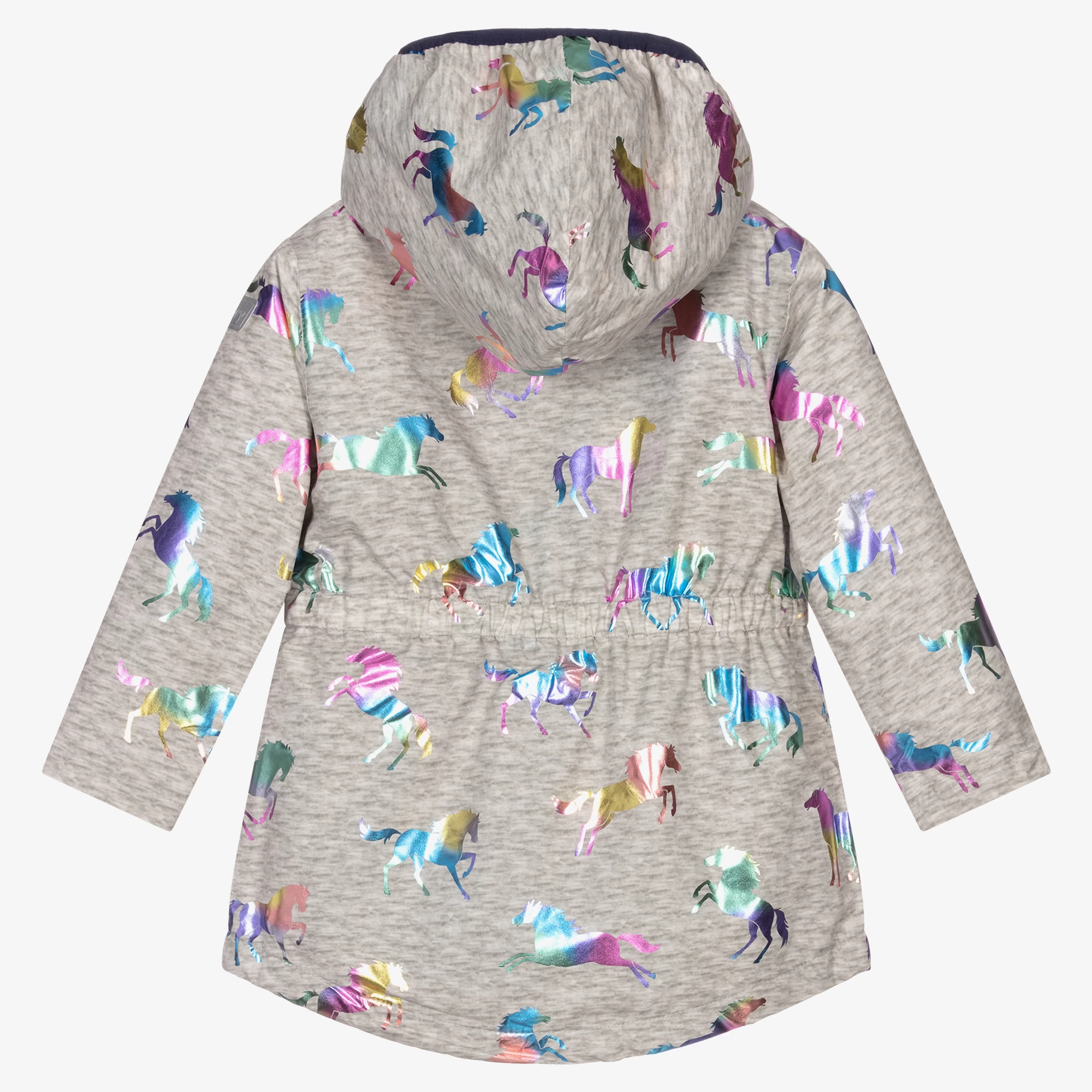 Grey hooded raincoat for girls by Hatley, with a marled print and foil rainbow horses. Waterproof, it is made in coated polyester with a cosy fleece lining. The coat has an elasticated waist for a feminine silhouette, front pockets and a reflective heart logo patch on the front. The shaped hem is slightly longer at the back.
