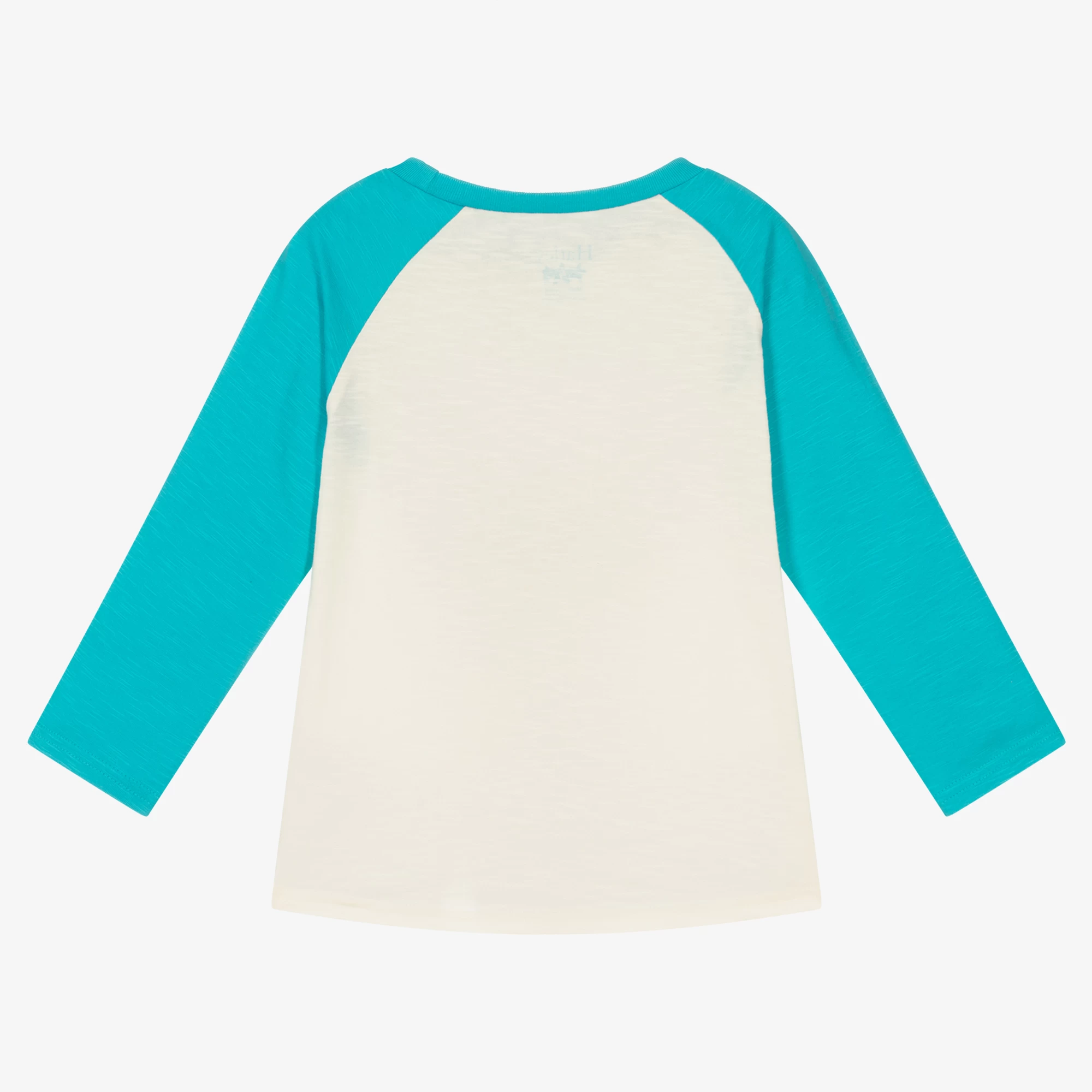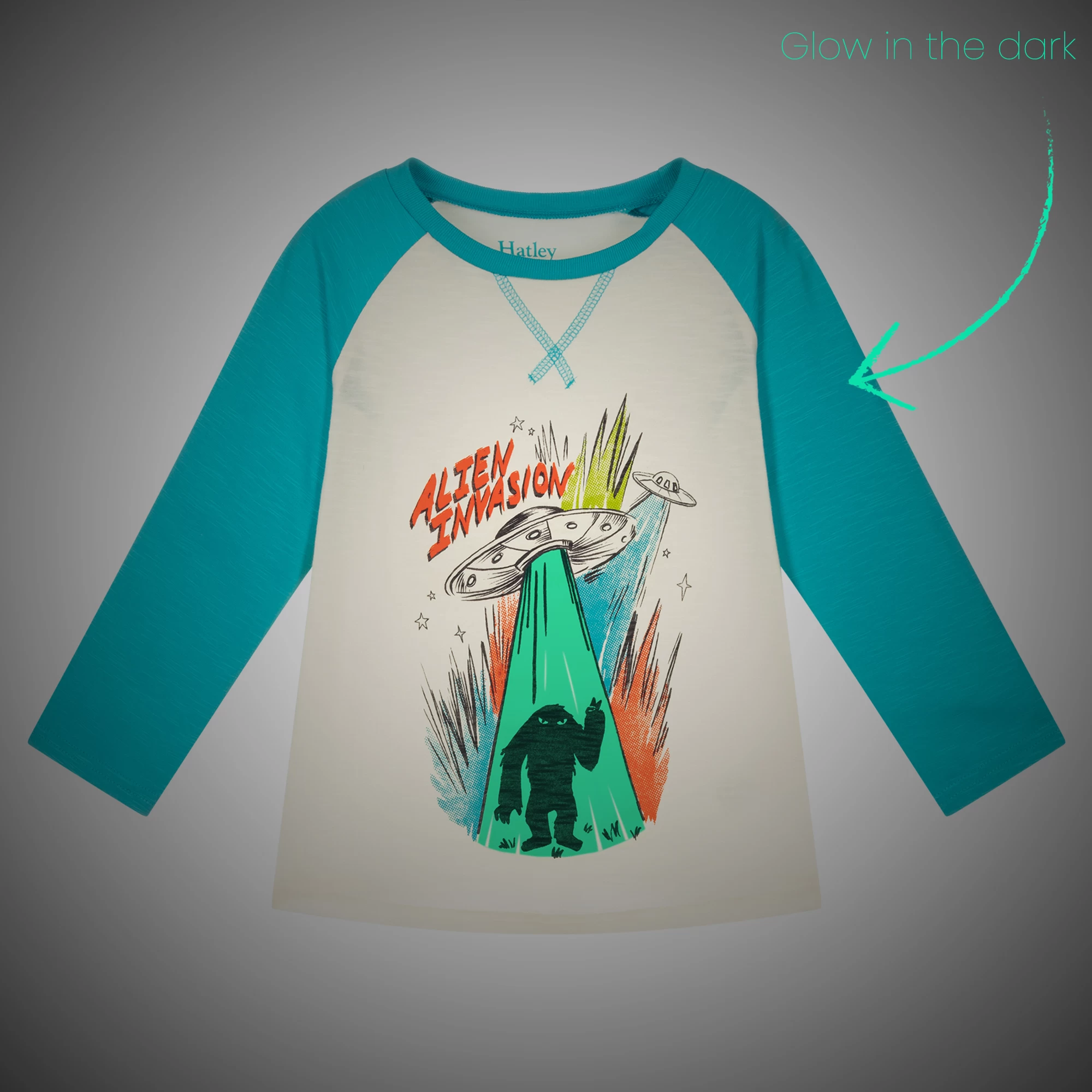 Ivory top for boys by Canadian brand Hatley, with a fun glow-in-the-dark alien print on the front in blue, orange and black. It is made in comfortable slub cotton jersey with turquoise blue raglan sleeves and trims.