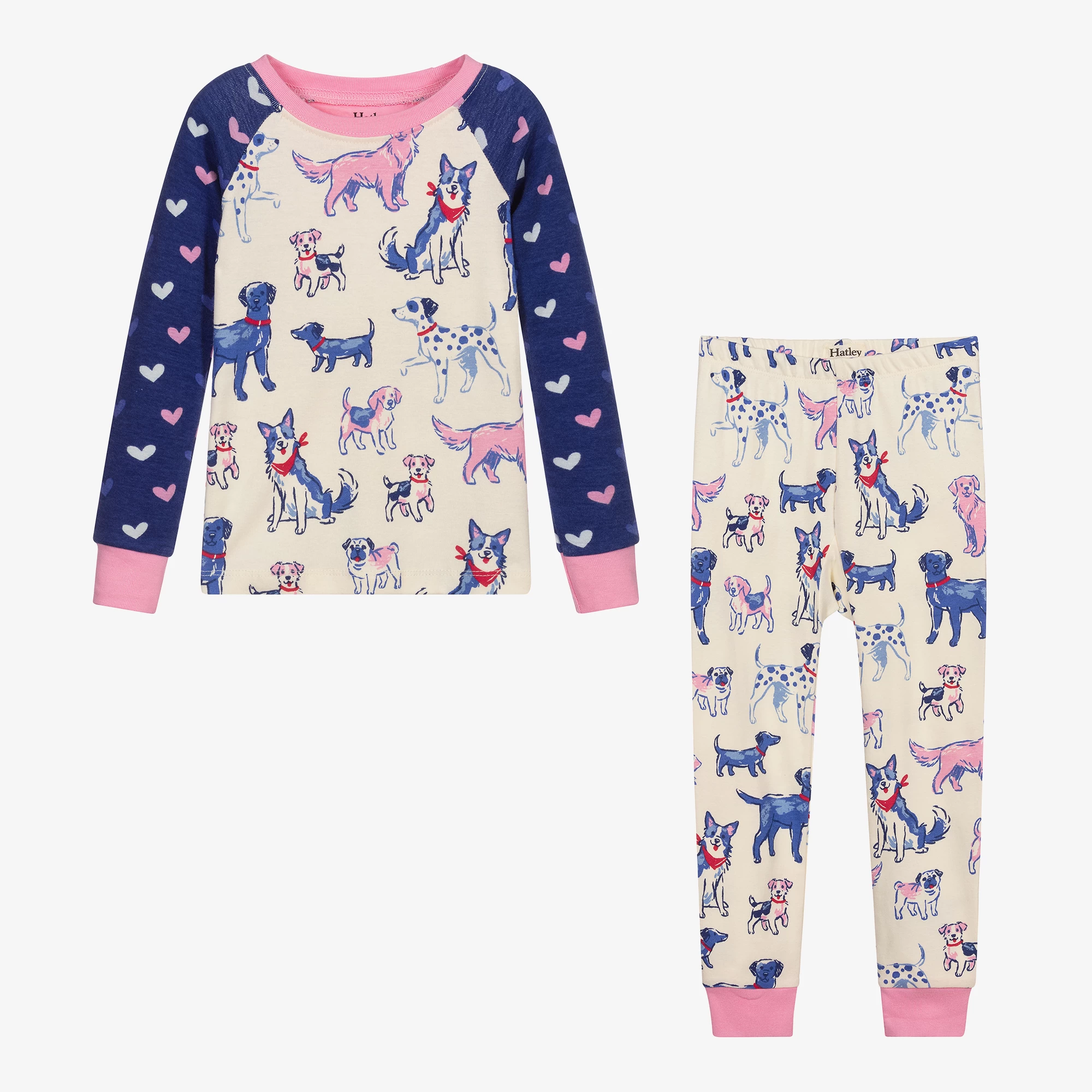Ivory pyjamas for girls by Hatley, with a fun blue and pink puppy print. Snug-fitting, they are made in comfortable, organic cotton jersey, with blue raglan sleeves patterned with contrasting blue, ivory and pink hearts. The brand’s logo is embroidered on the back of the top in pink, matching the pink ribbed trims.