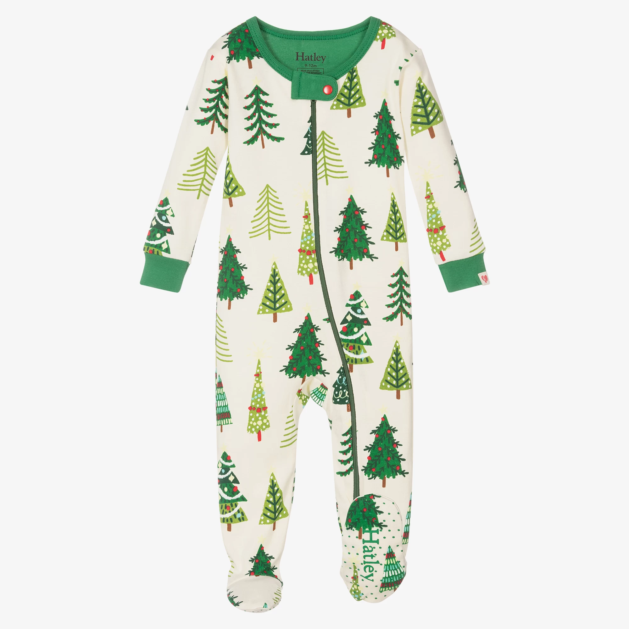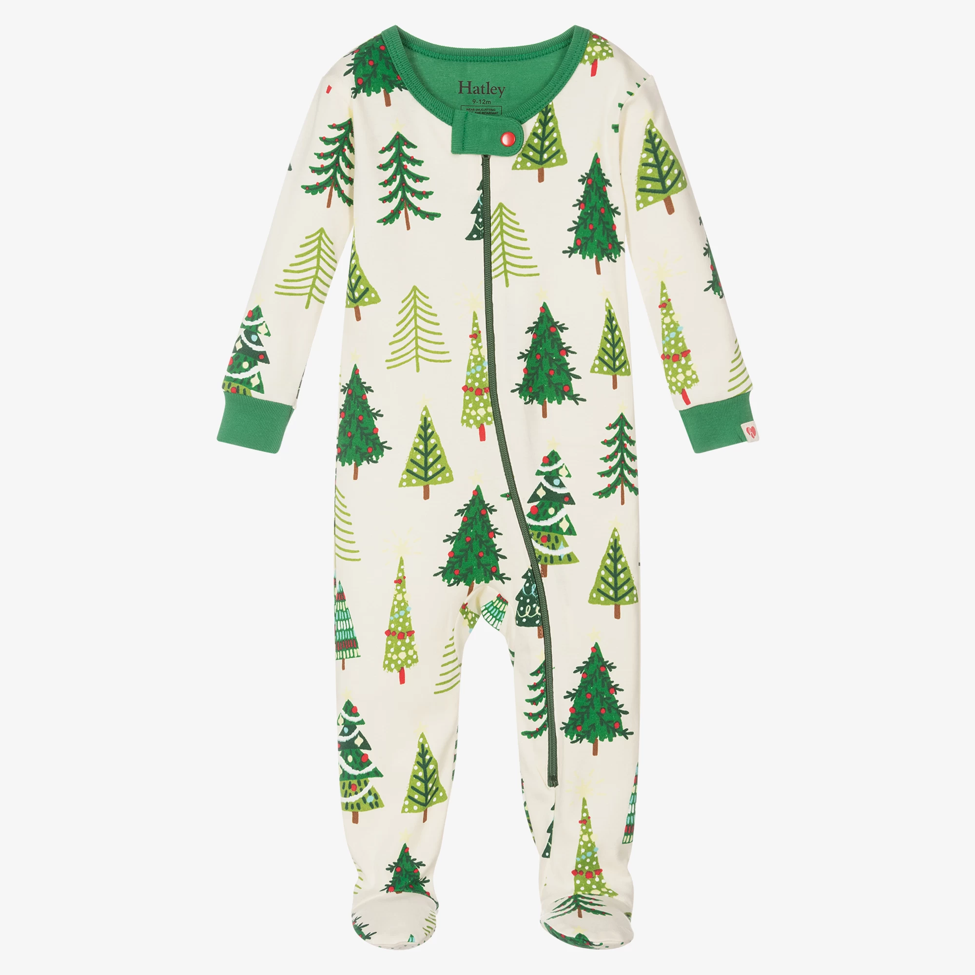 Festive ivory babygrow for boys and girls by Hatley, made in soft cotton jersey. It has an all-over Christmas tree print, with fun glow in the dark stars. It fastens with a zip on the front and has a popper fastening neckline.