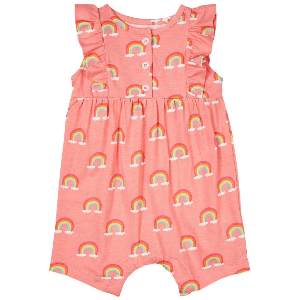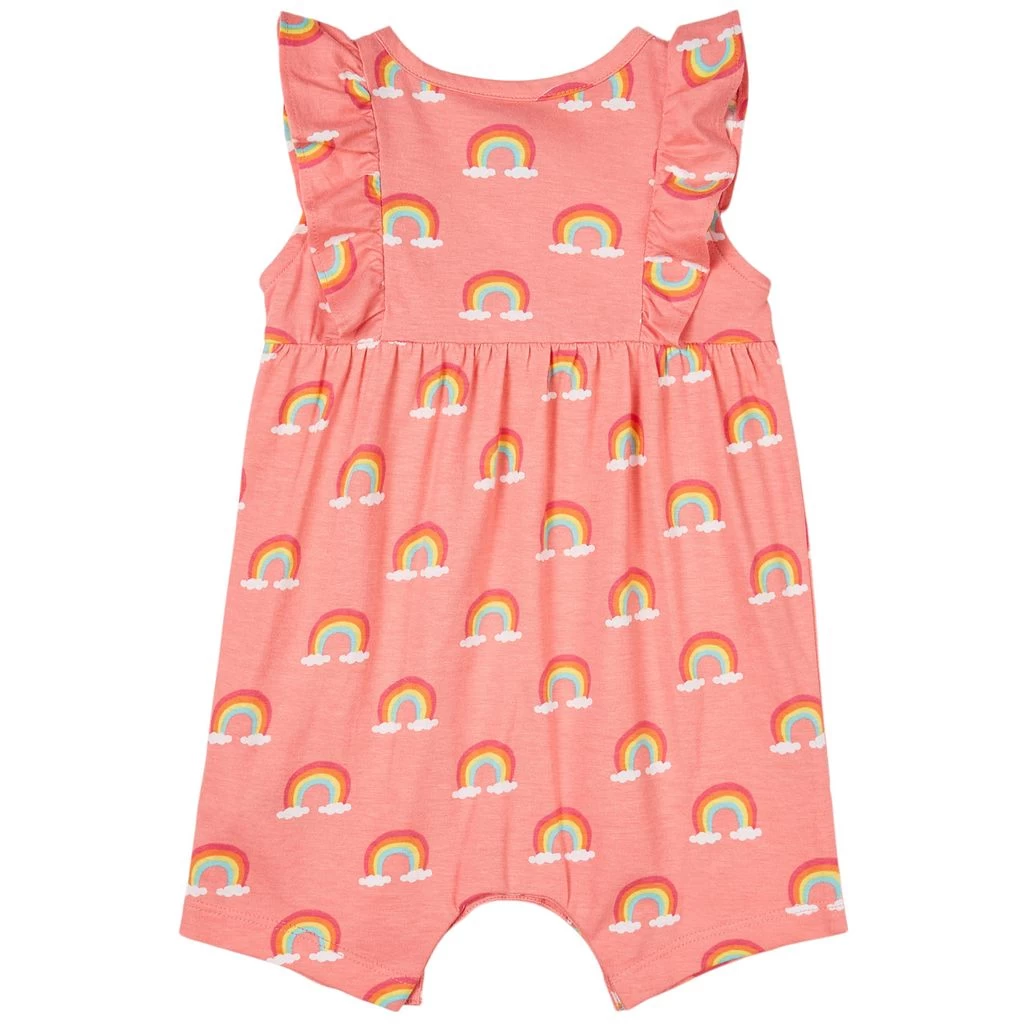 Pink Over The Rainbow romper by Hatley. The romper has ruffle details at the shoulders. It has a button closure at the front and snap buttons between the legs.