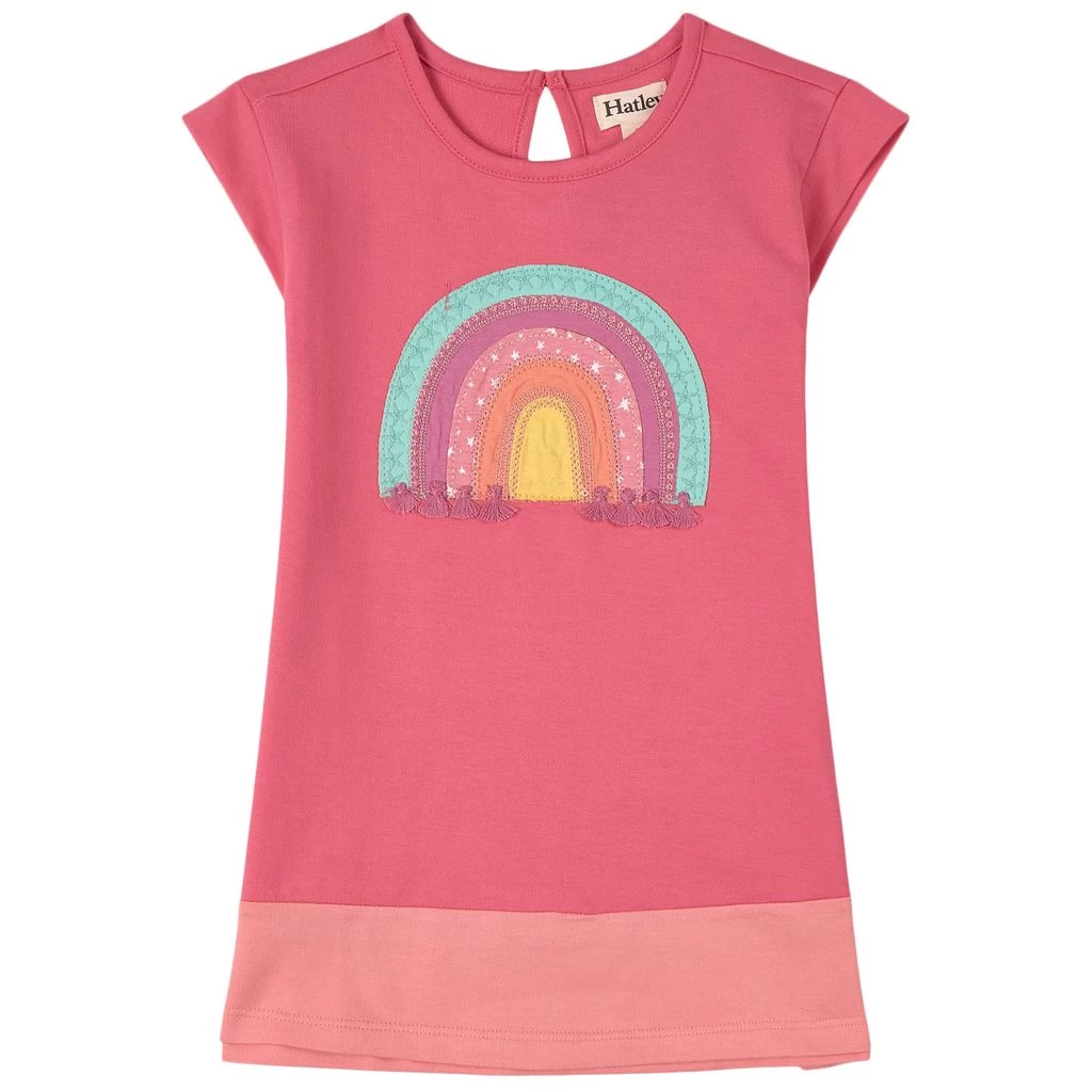Pink Over The Rainbow Terry dress by Hatley. The dress has an embroidery detail at the front. It has a button closure at the back and cap sleeves.
