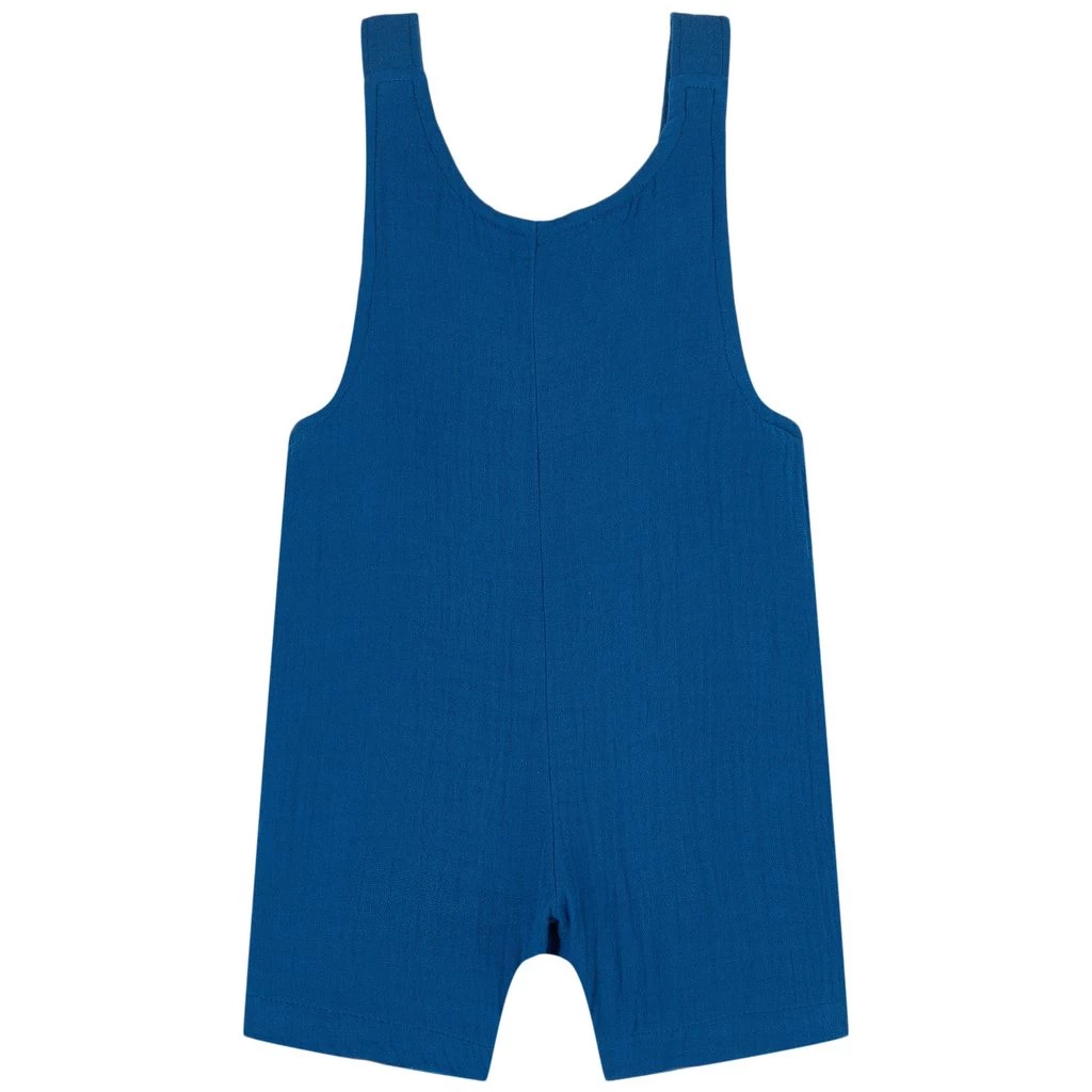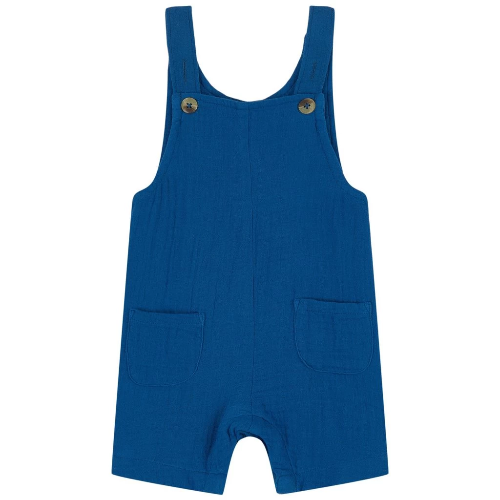The perfect summertime look. Blue overall shorts by Hatley. The overall shorts has shoulder straps. It has two front pockets and snap buttons between the legs.