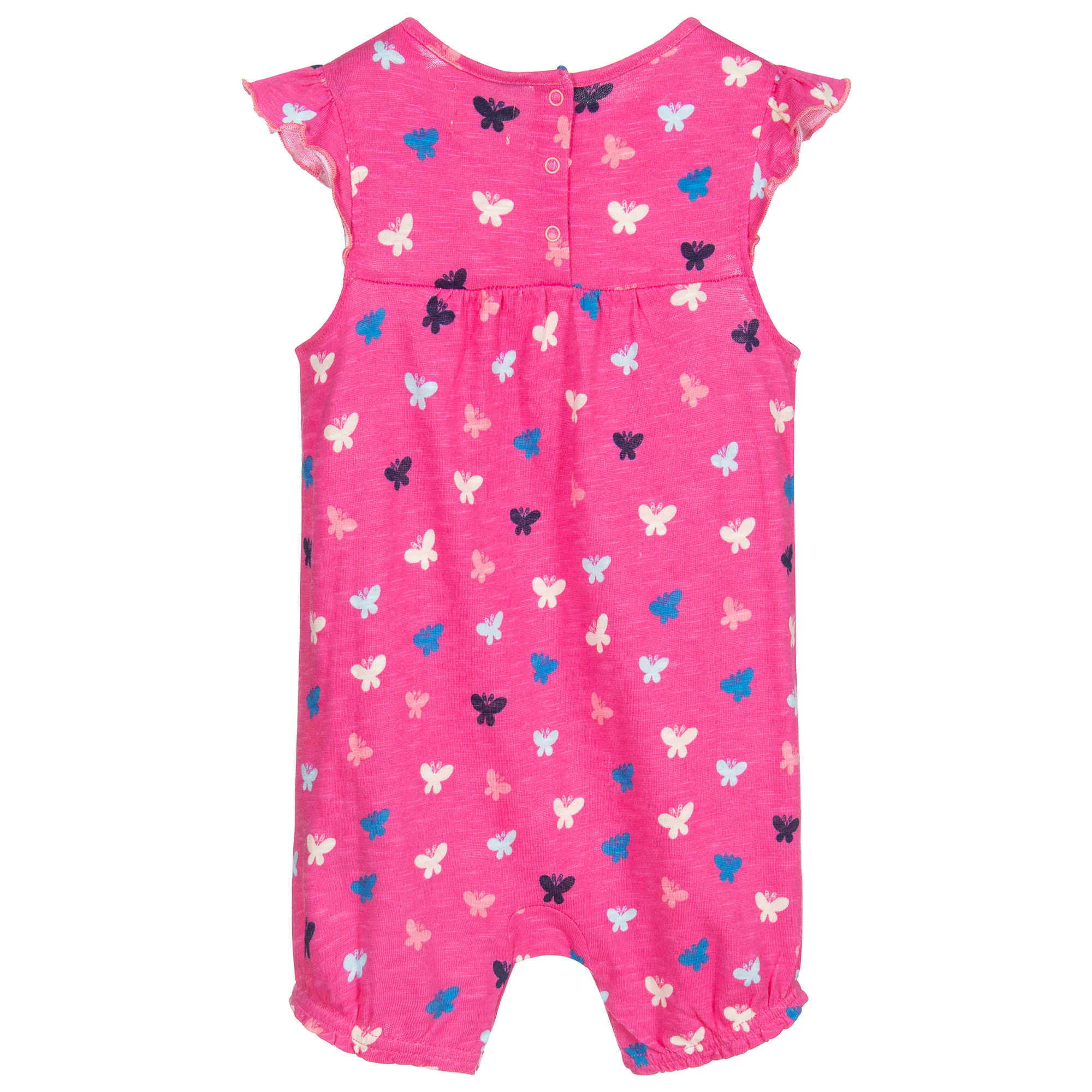 Bright pink shortie for baby girls by Hatley, made in soft and stretchy cotton jersey. It has a colourful butterfly print and ruffles over the shoulders.