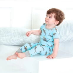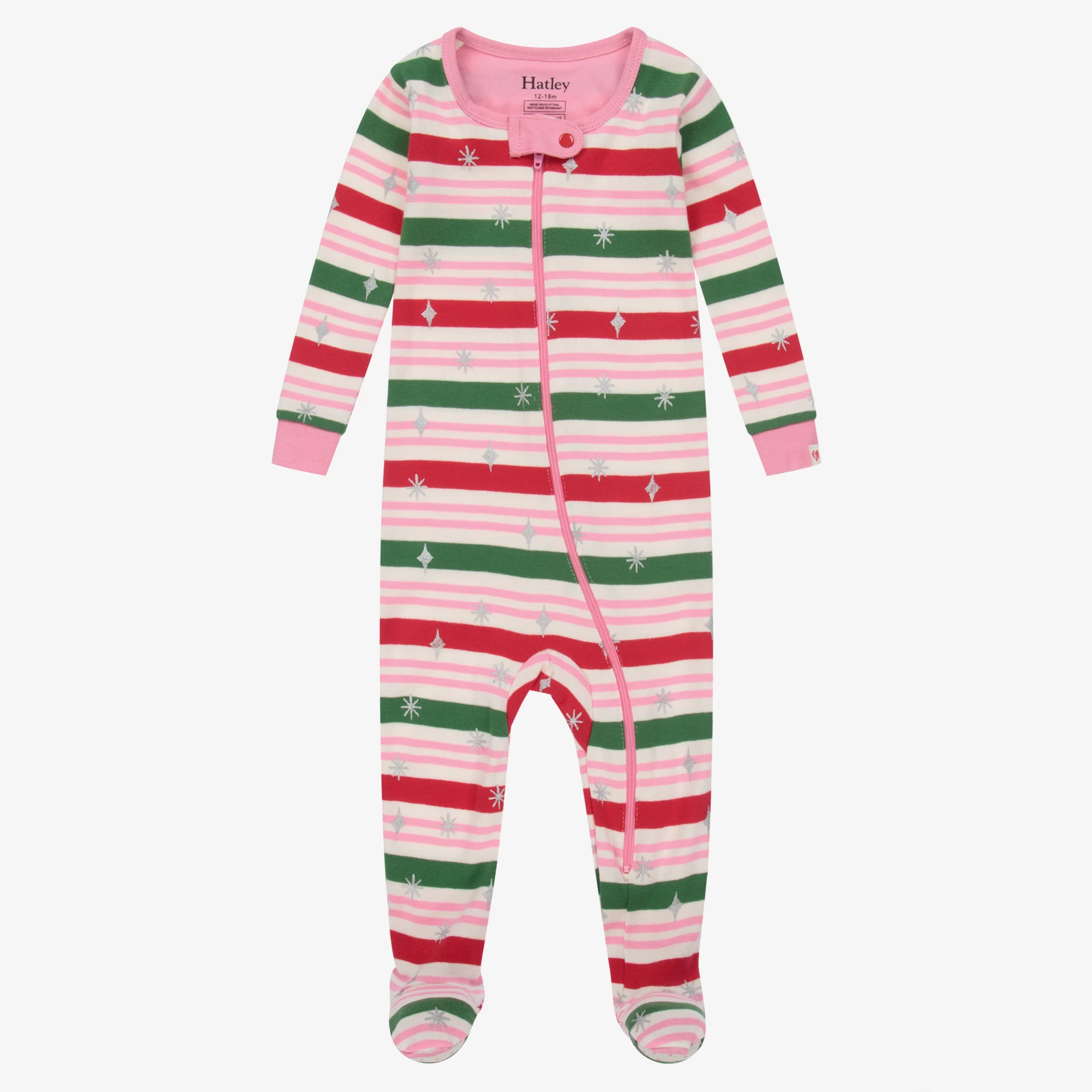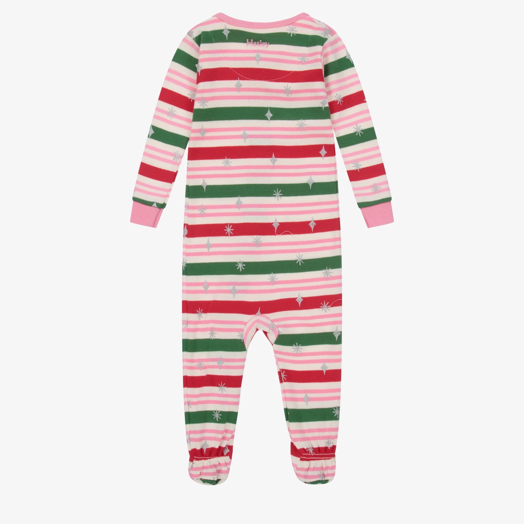 From Canadian brand Hatley, a soft cotton jersey babygrow for girls. Striped in ivory, pink, red and green, it has a silver star and diamond pattern, and pink ribbed trims and non-slip grips on the soles. There is a long zip fastening down the front with a popper-fastening chin guard. When worn as pyjamas, the babysuit should fit snugly.