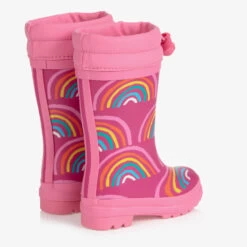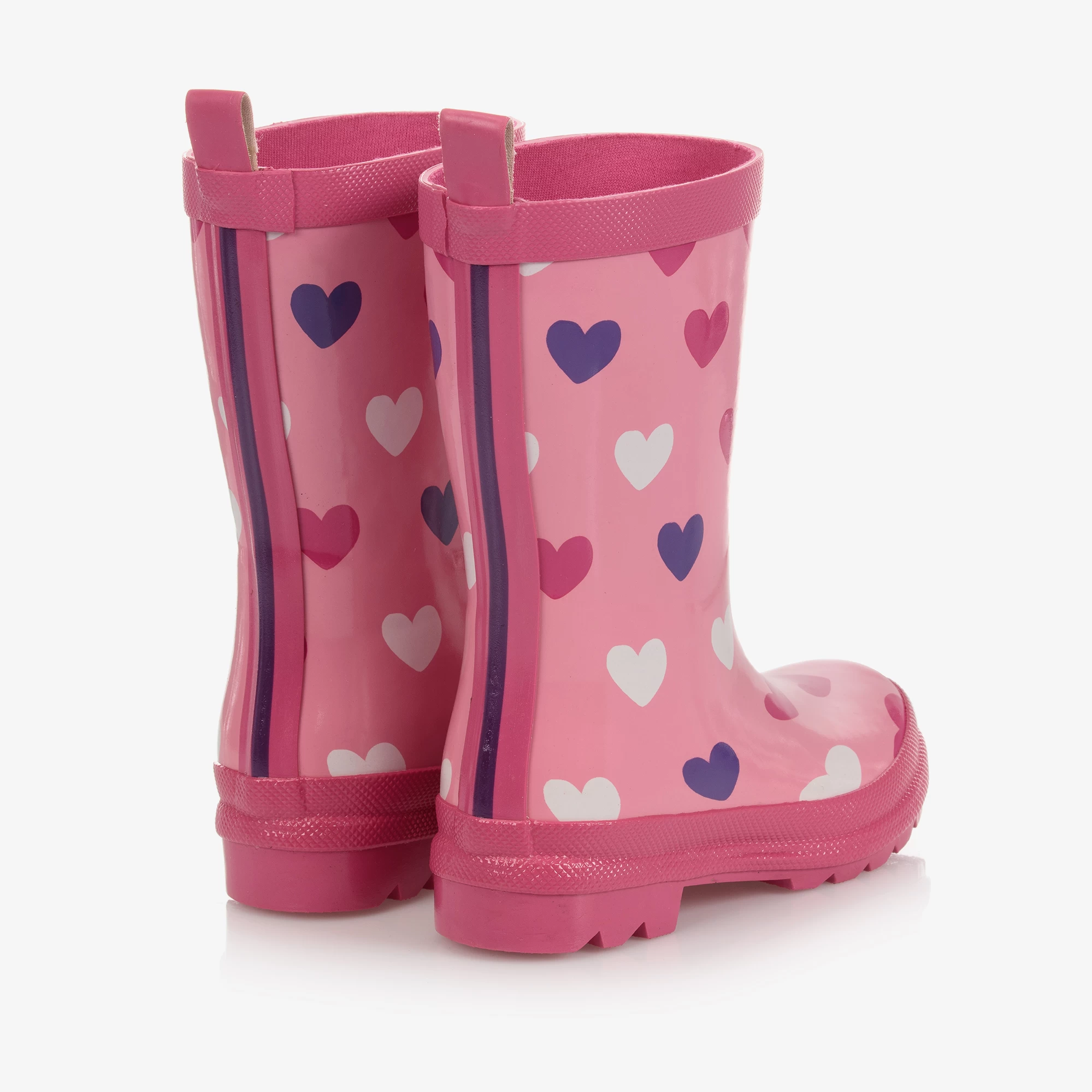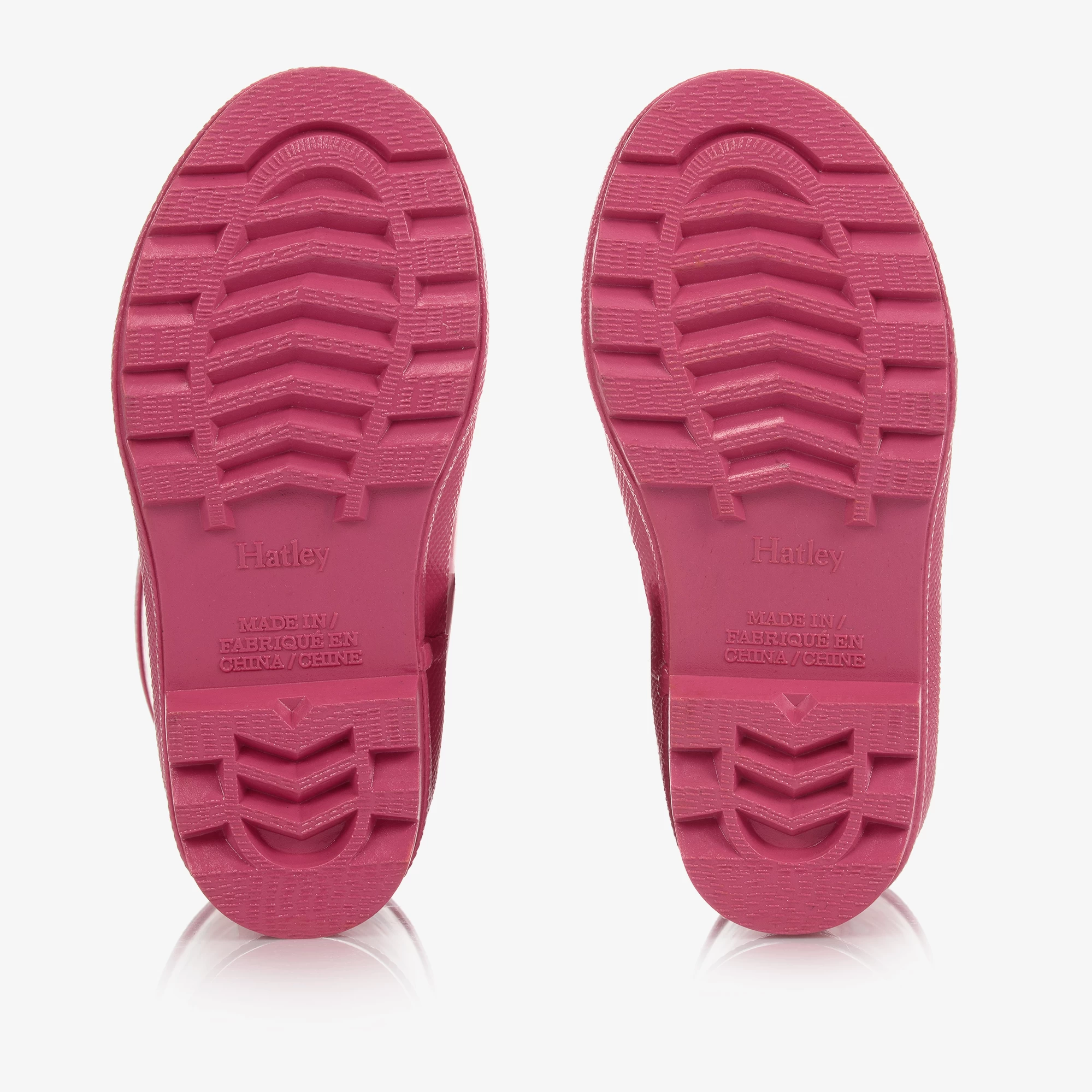 Girls pink rubber rain boots by Hatley, with a purple and white ‘Scattered Hearts’ pattern. They have moulded rubber soles for a good grip and a soft cotton lining. There is a pull tab on the back and a logo patch on the front.