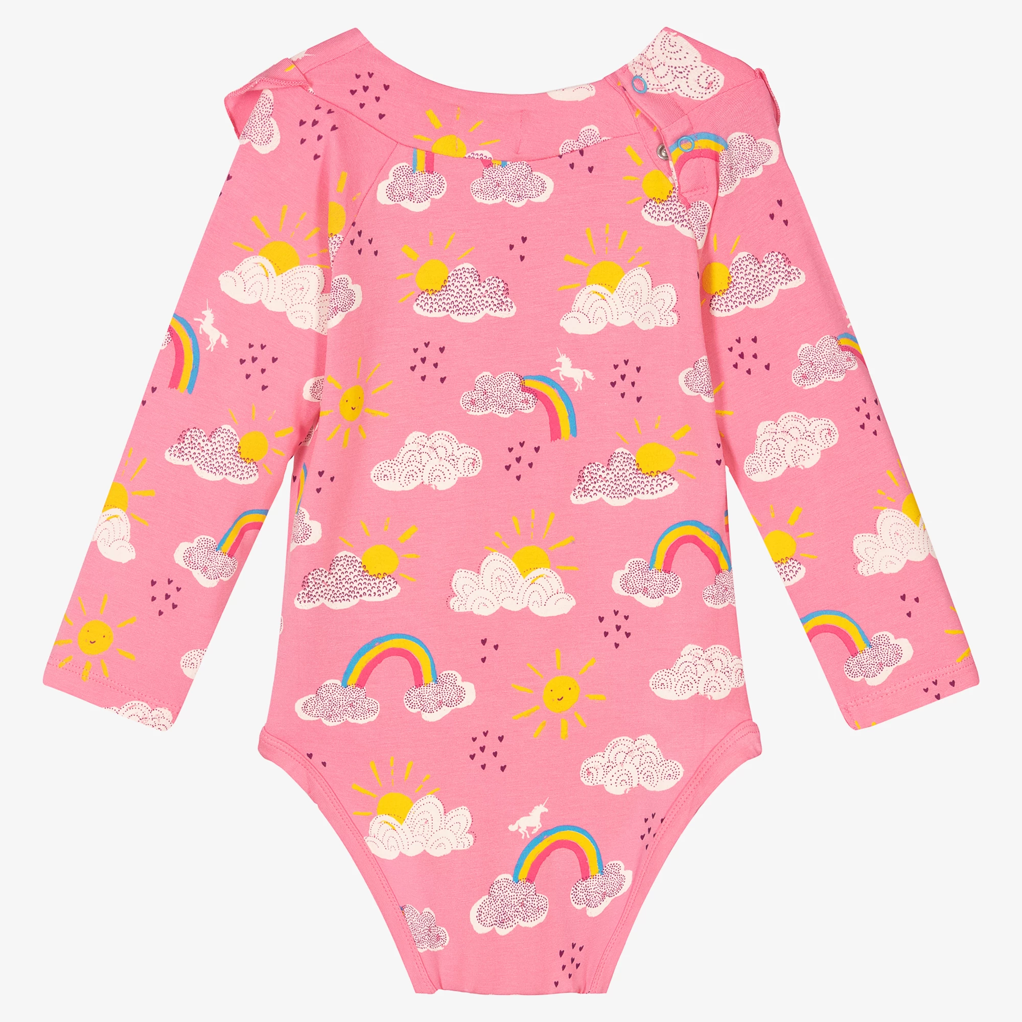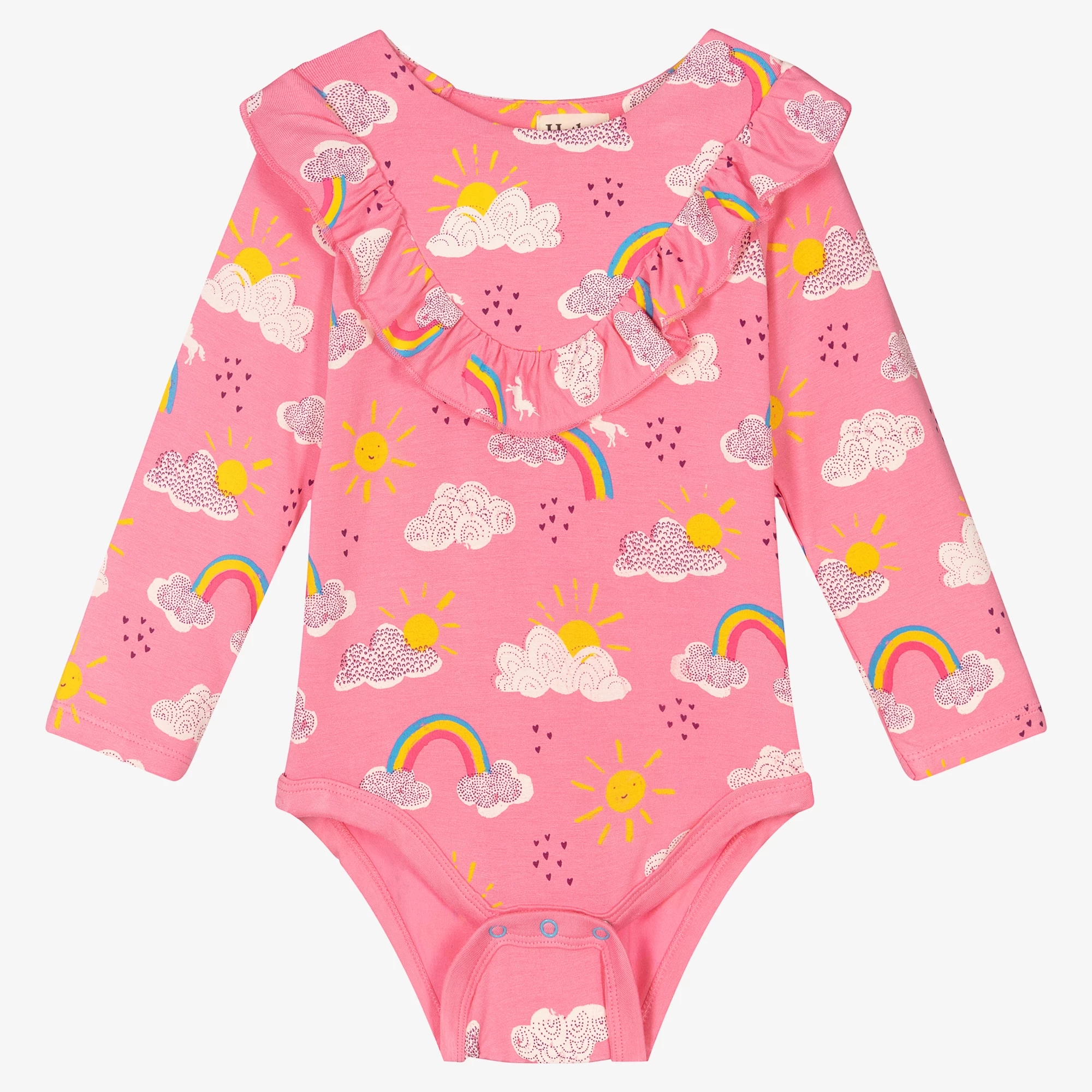 Pink bodysuit for baby girls by Hatley, made in super soft and stretchy modal jersey. It has a colourful rainbow, sun and cloud pattern, with pretty ruffle trim on the front.