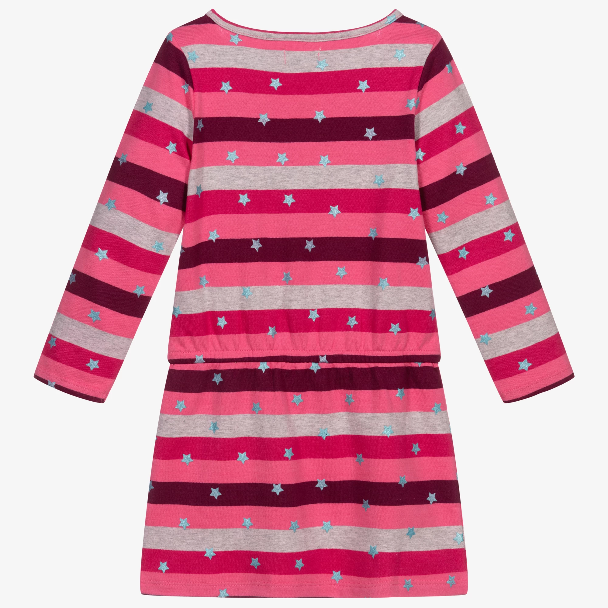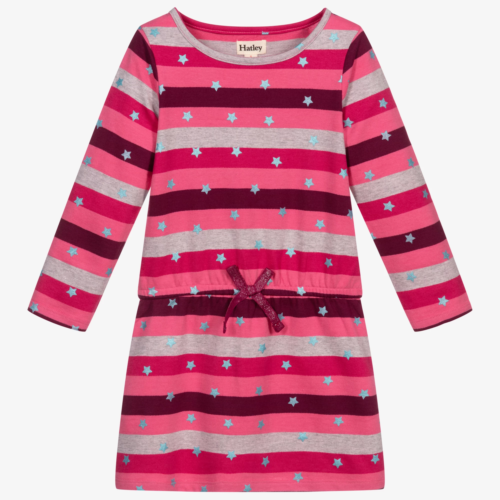 Soft polycotton jersey dress for girls by Hatley. This long sleeve dress is patterned with blue sparkly stars, and pink and grey horizontal stripes. It has a useful elasticated waist with a decorative sparkly red bow.