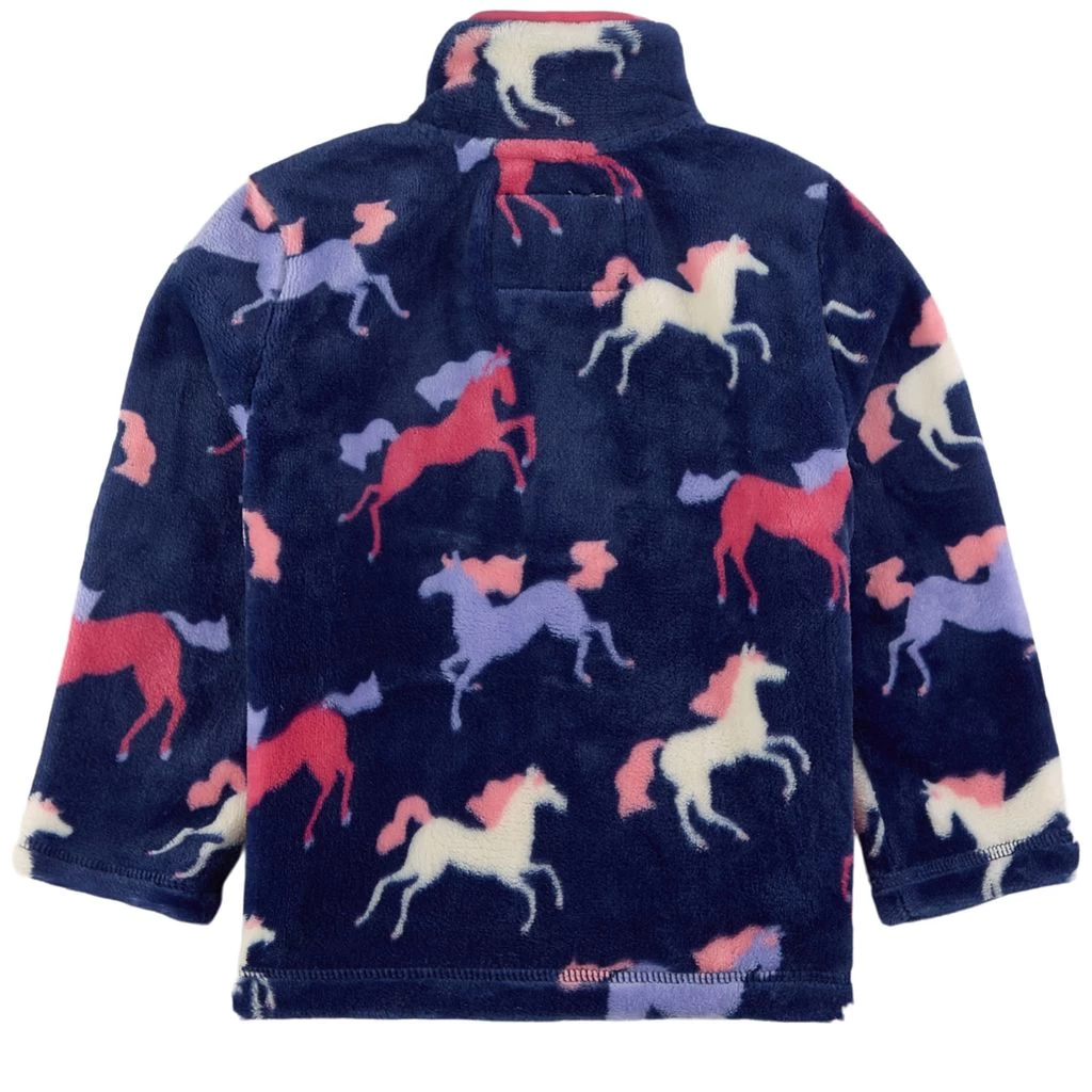 Keep warm with comfy fleece. Navy fleece jacket by Hatley. The jacket has a zip closure at the front. It has two front pockets and ribbed cuffs.