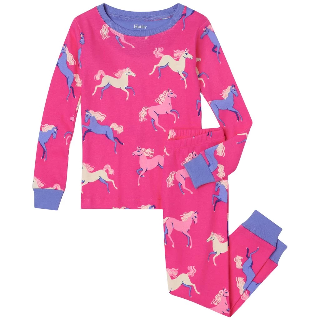 Perfect for a good night’s sleep. Pink pyjamas by Hatley. The pyjamas have a comfy design. They have a pajama top with ribbed cuffs and trousers with an elasticated waist and ribbed cuffs.