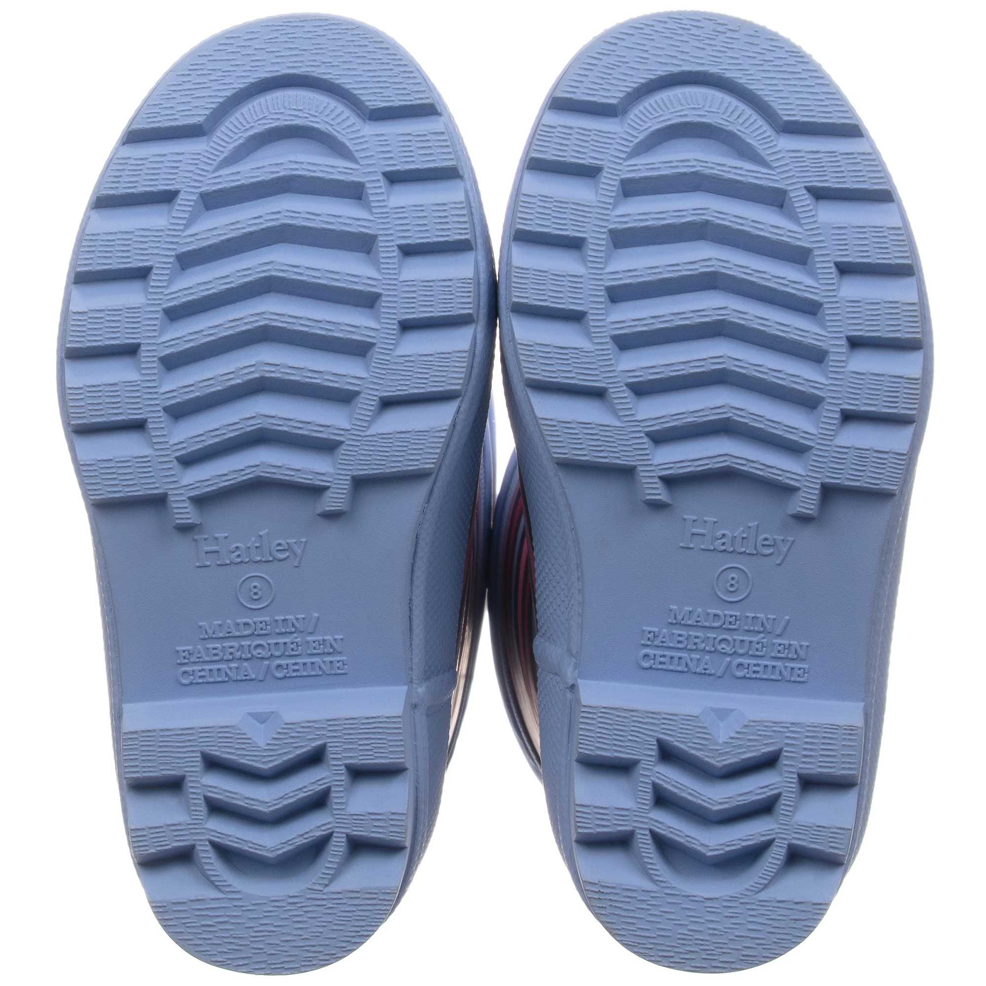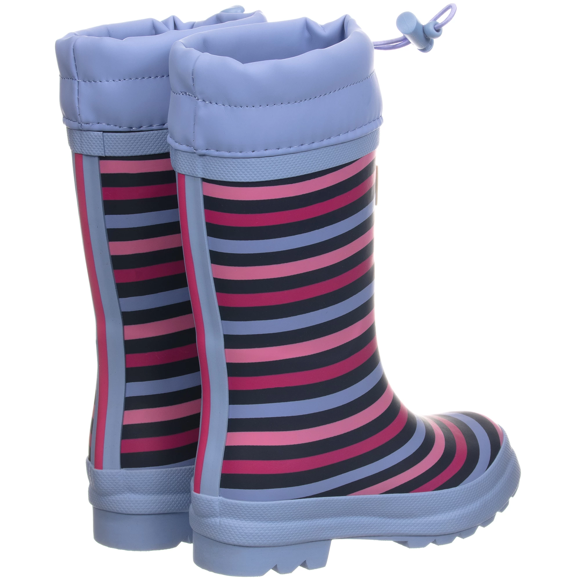 Girls purple, pink and navy blue striped rain boots by Hatley, with padded, toggle-fastening trim. Made in PVC-free rubber, they have a soft, plush lining and fabric insoles. The outer soles are slip-resistant and there is a silver branded patch on the front of the boot.