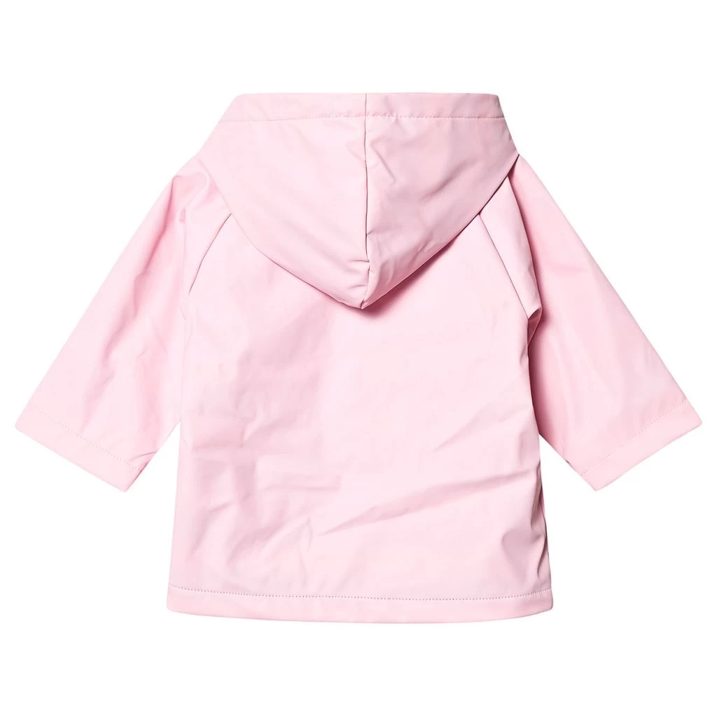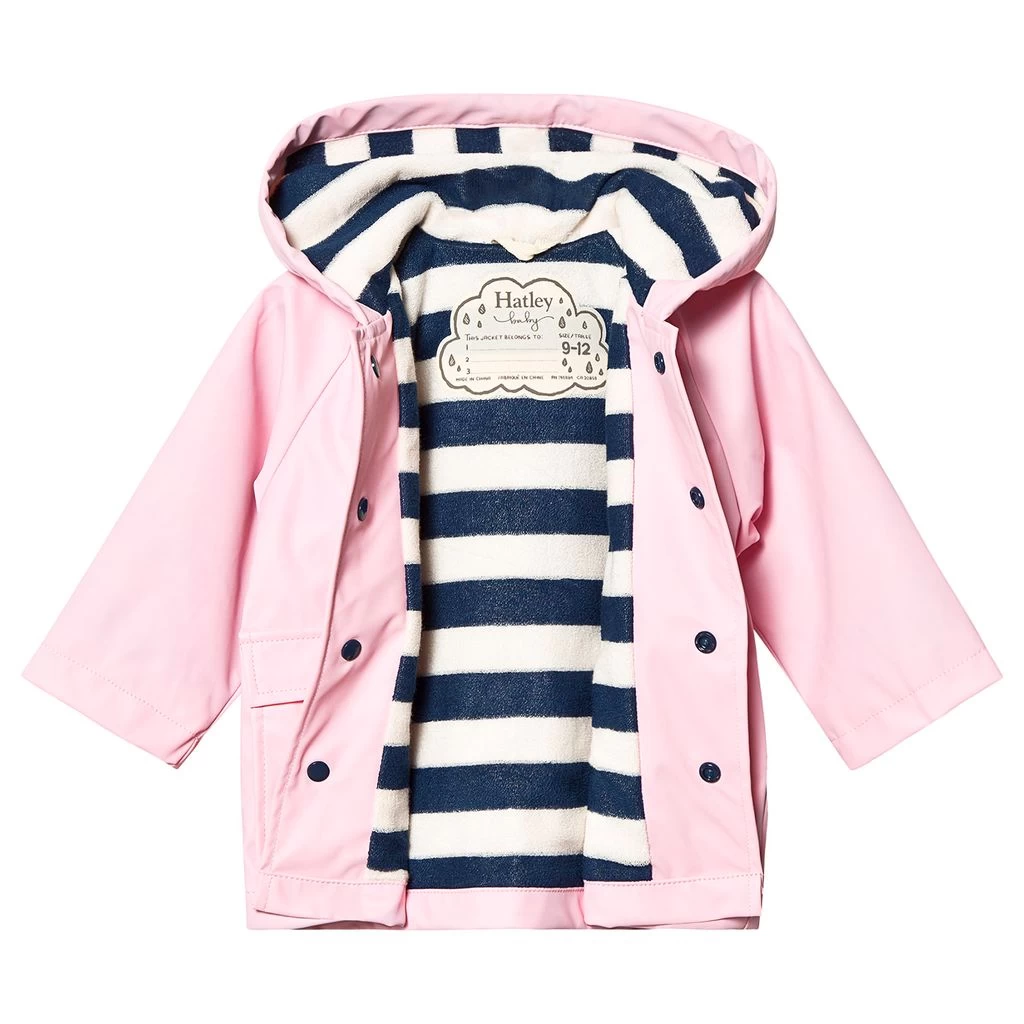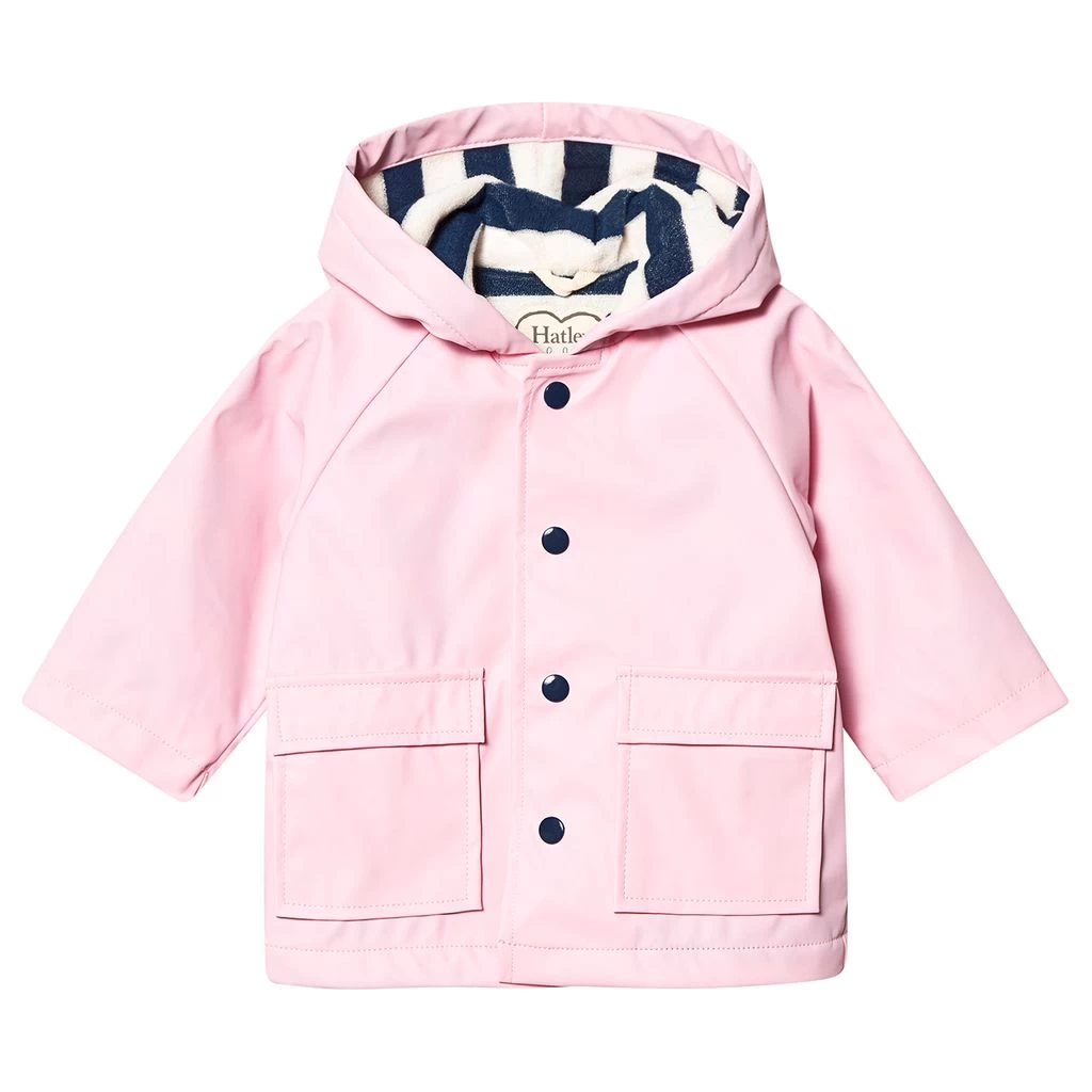 Pink, waterproof, PVC-free raincoat by Hatley. The jacket has a cotton terry lining. It has a snap button closure at the front and two front pockets.