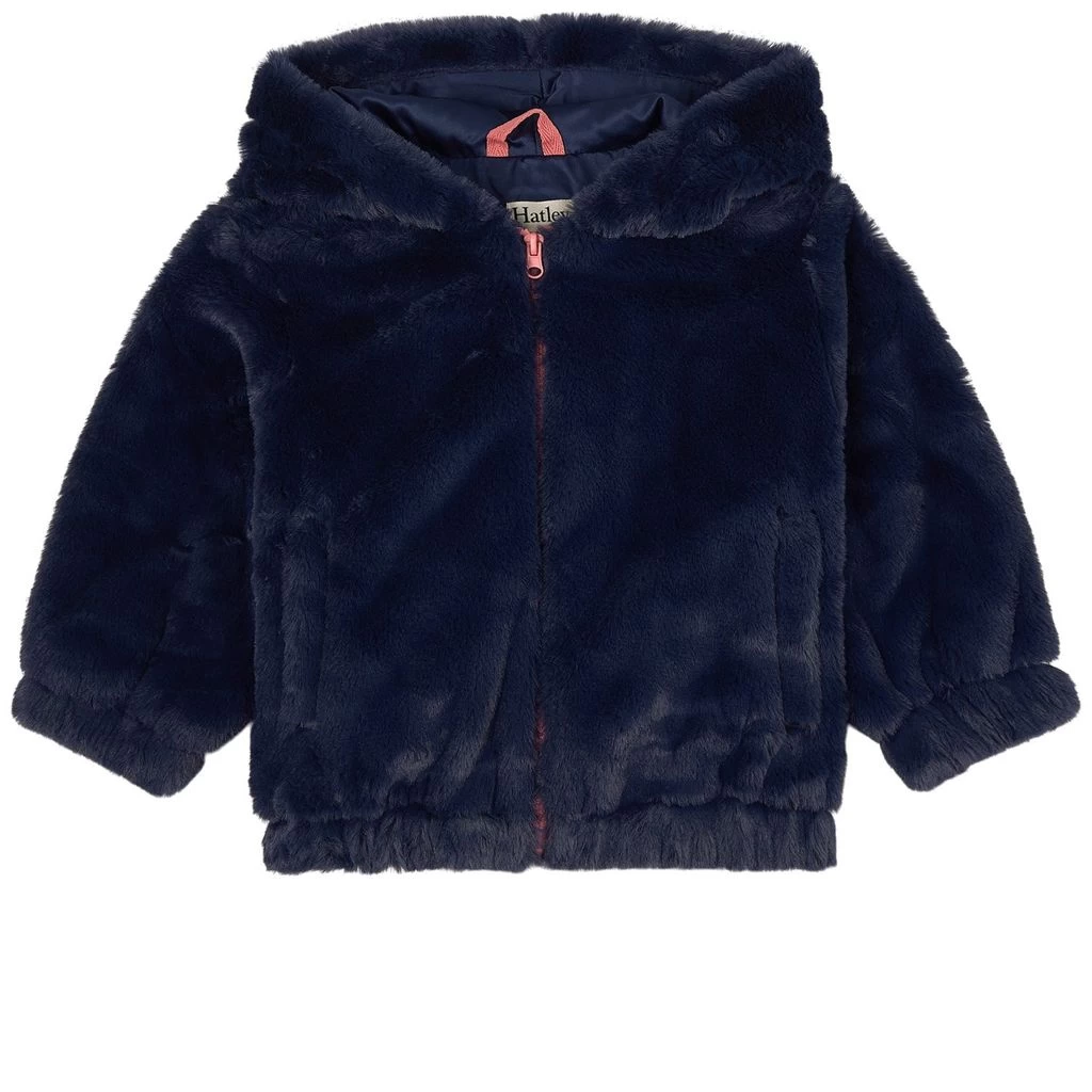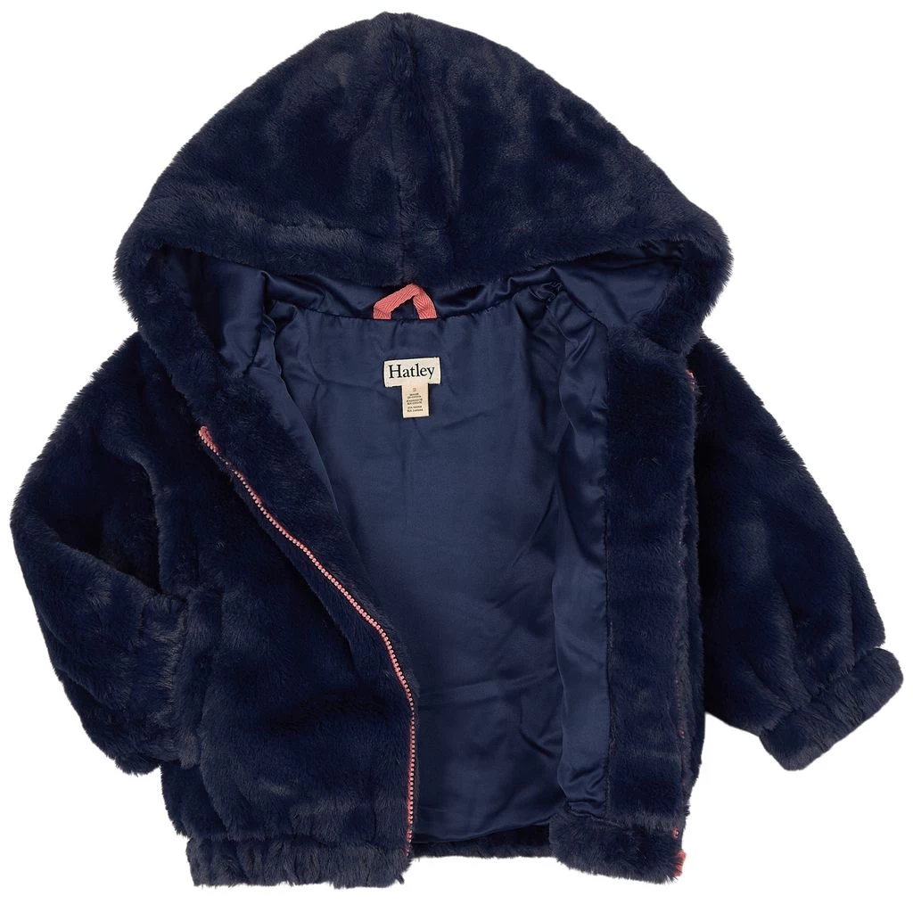 A cute and stylish look. Blue Rainbow bomber jacket by Hatley in faux fur. The jacket has a fixed hood. It has a zip closure at the front, two front pockets, an elasticated cuffs and hem, a rainbow shaped motif at the back and a satin lining.