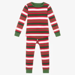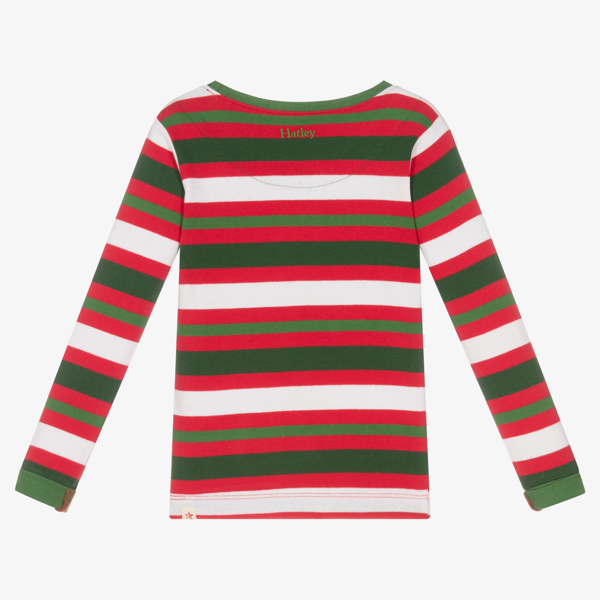 In a green, red and white candy cane stripe, these long pyjamas for boys and girls are by Hatley. Designed to fit snugly, they are made in soft organic cotton jersey and have ribbed trims.