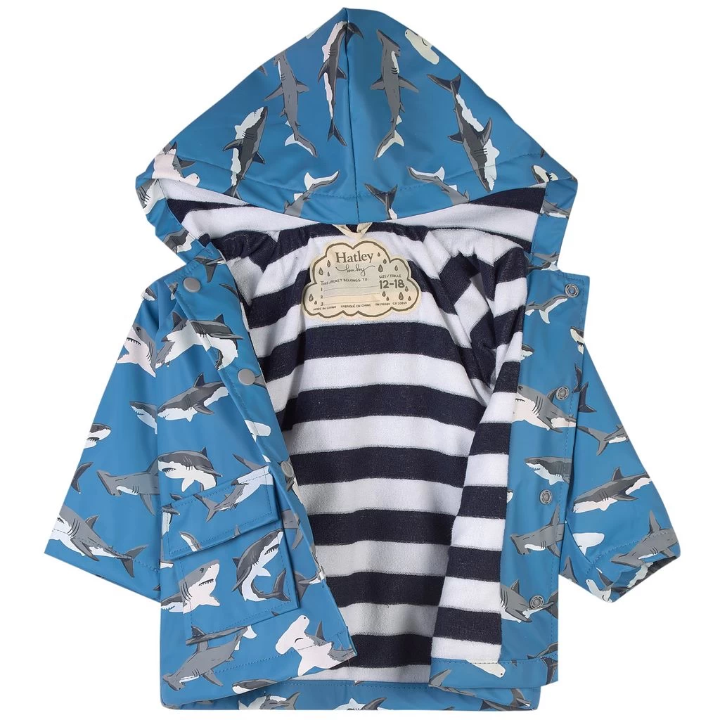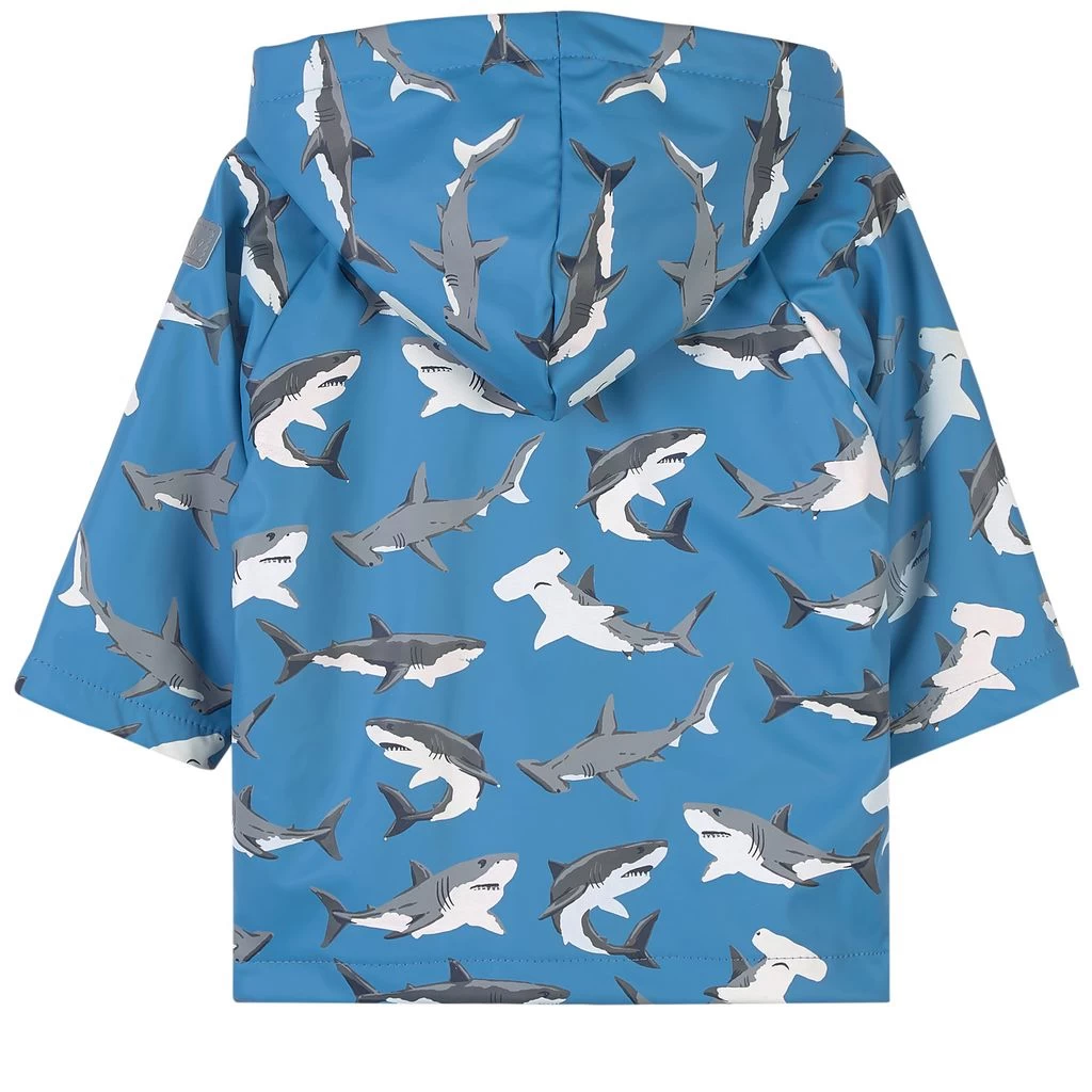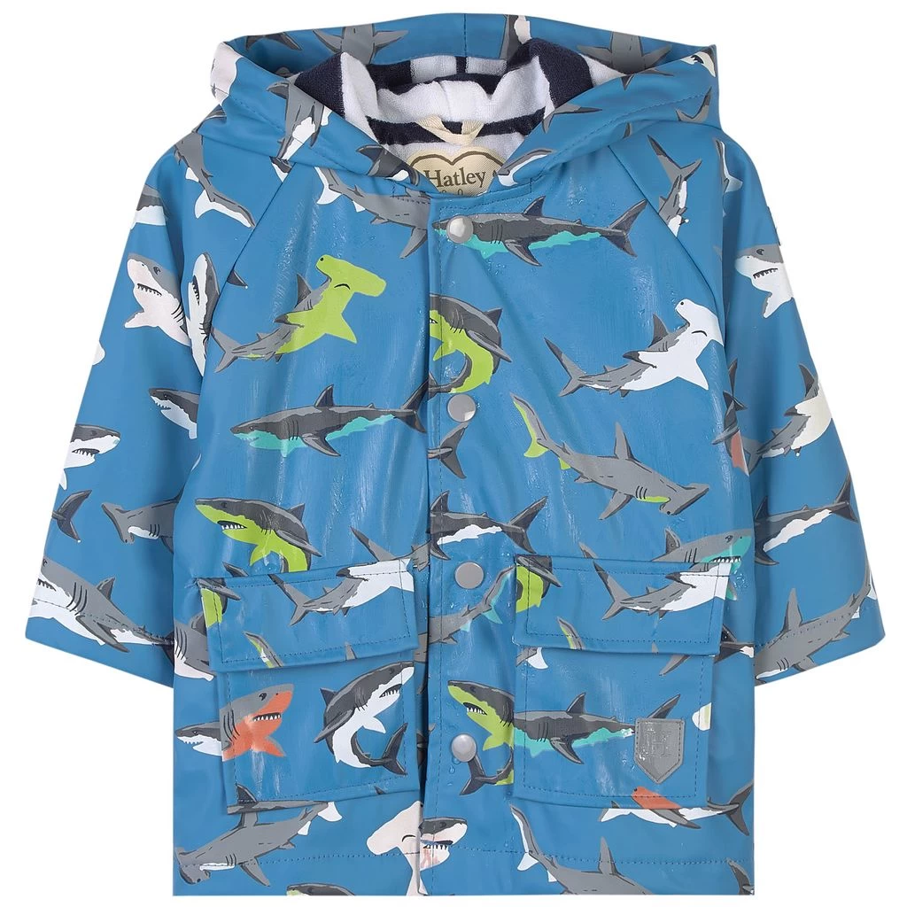 Blue Shark Print rain jacket by Hatley. The jacket has a terry fleece lining. It has a fixed hood, a snap button closure at the front and two front pockets.