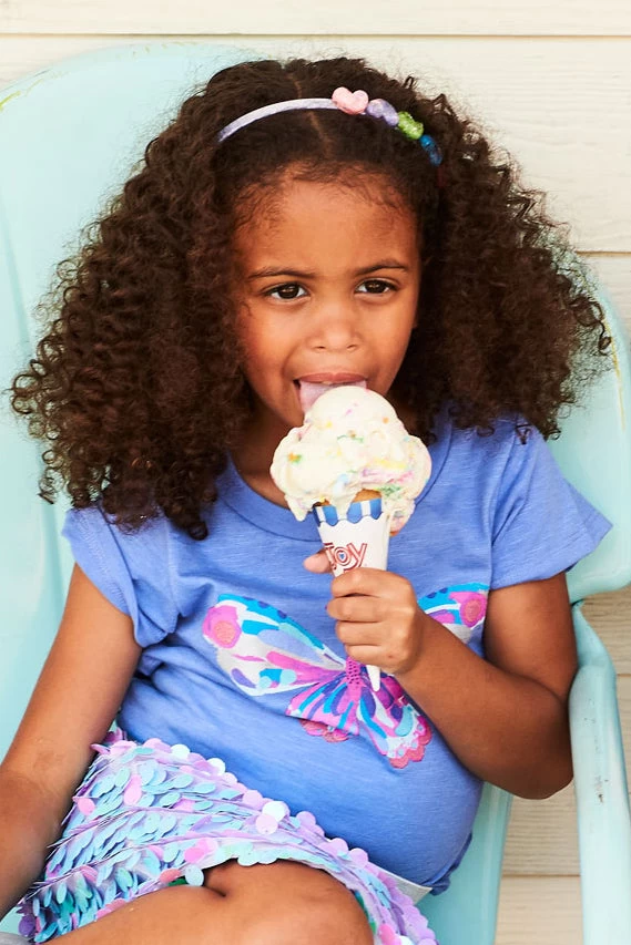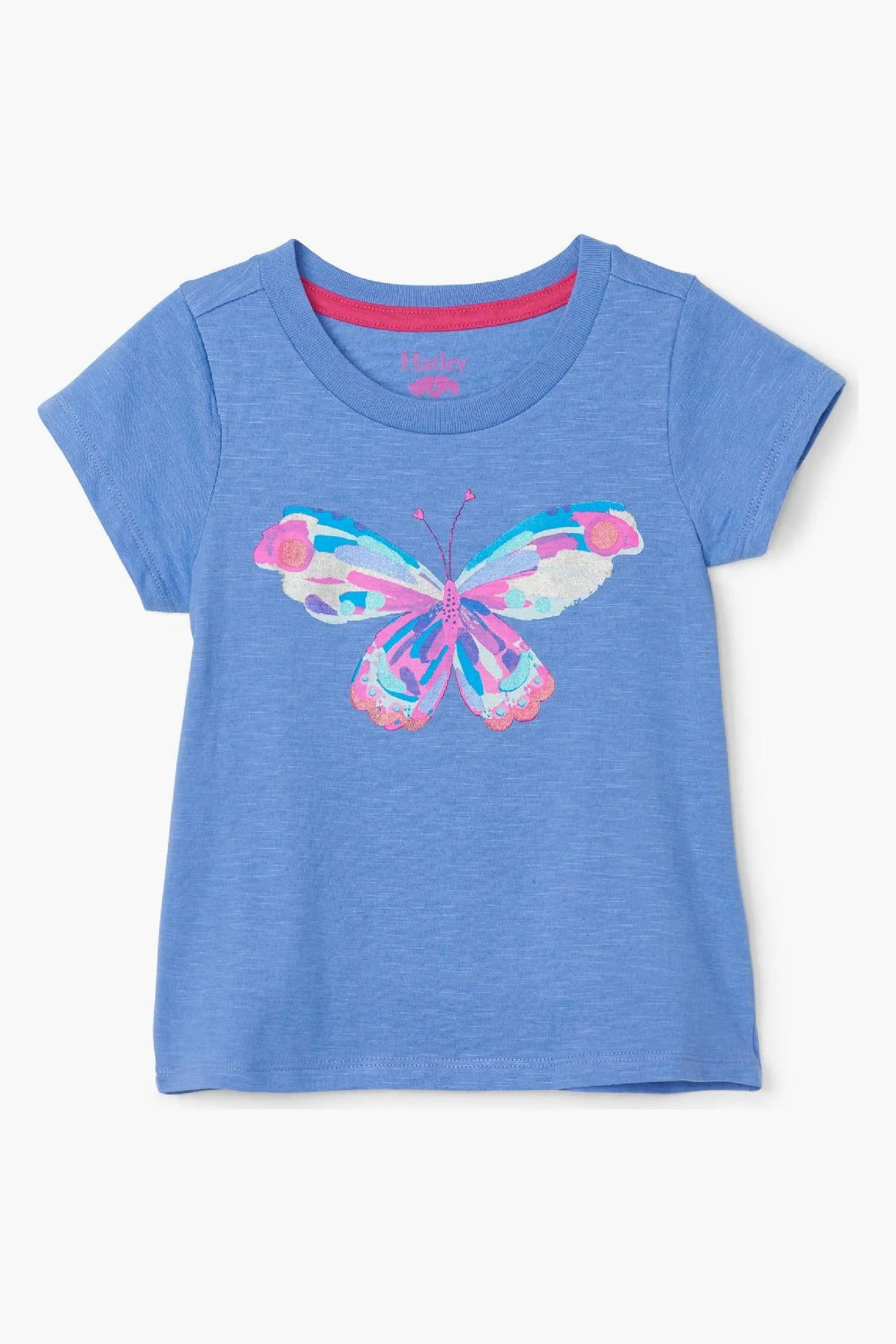 features a colorful and glittery butterfly on the front. 60% cotton, 40% polyester, machine wash.