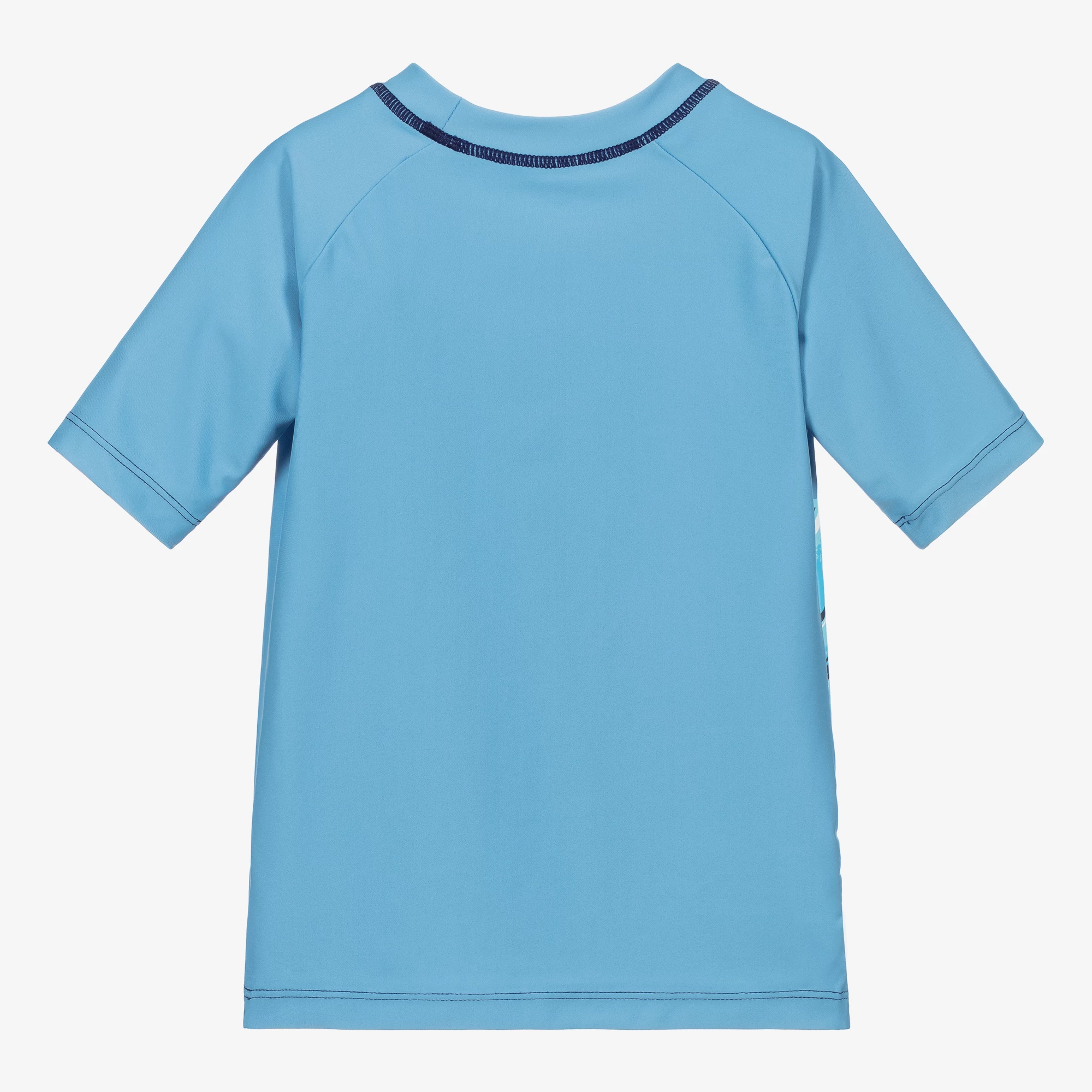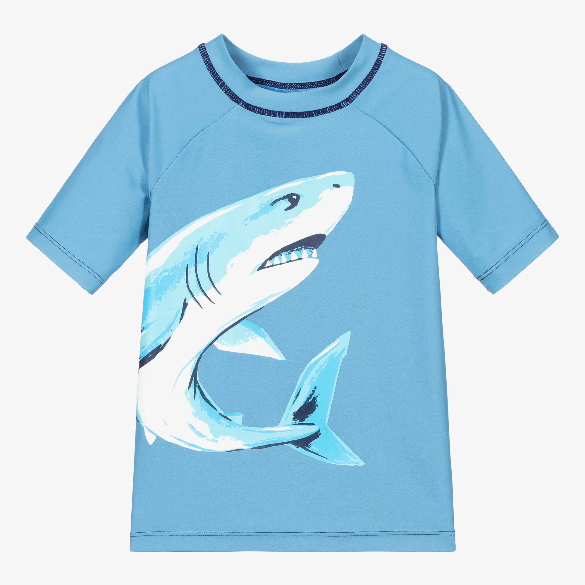 Boys blue sun protective rashguard top by Hatley with a white shark print. It is silky and stretchy and can be worn in the water.