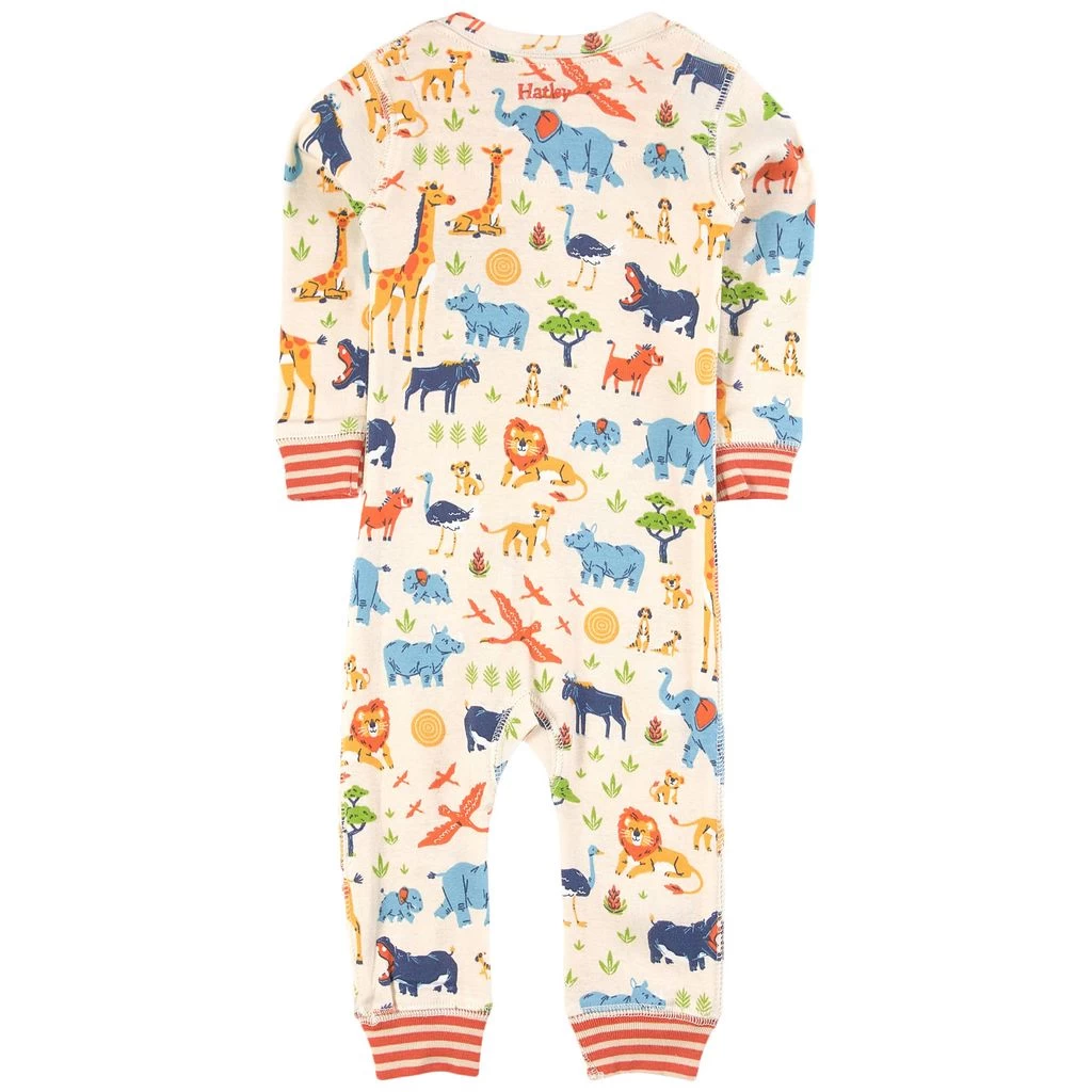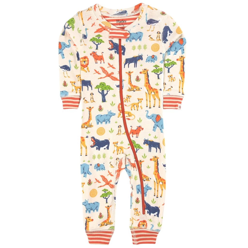 Cream Wild Safari Print footed baby body by Hatley. The footed baby body has a zip closure with a snap button closure at the front. It has a closed feet.